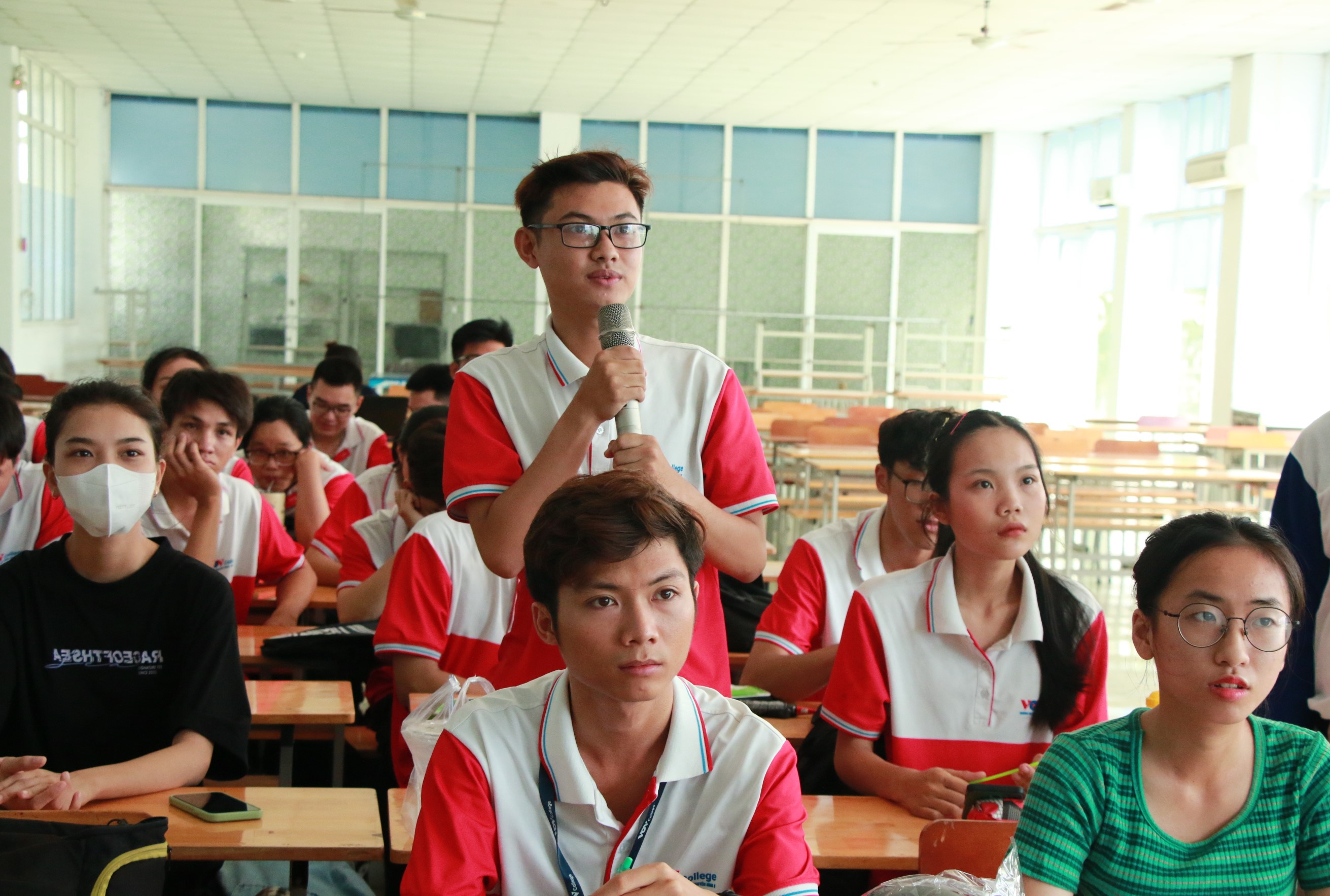 Hướng dẫn viên chia sẻ nhiều kiến thức bổ ích và tương tác với sinh viên qua những câu hỏi về an toàn giao thông