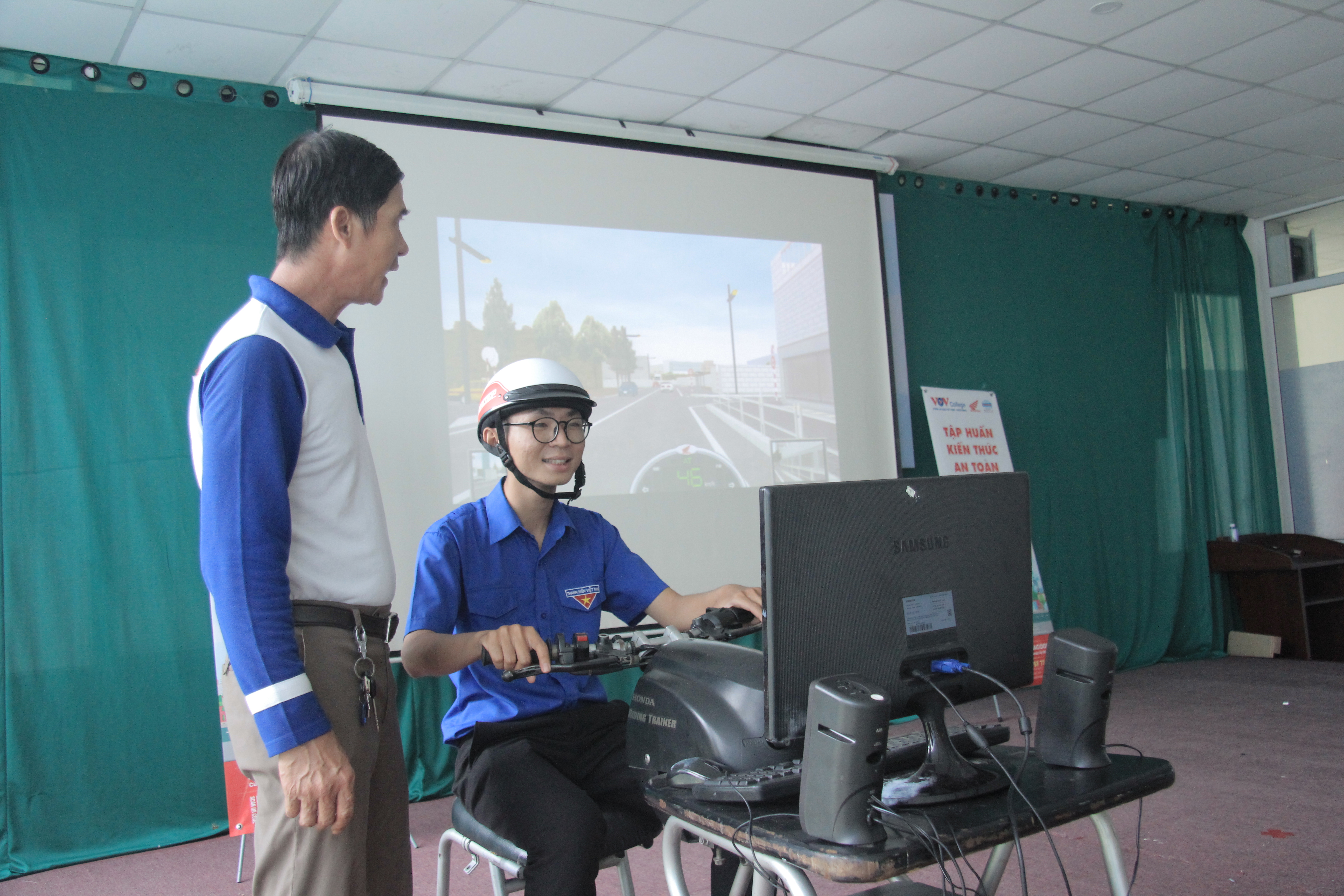 Tham gia buổi tập huấn, đoàn viên thanh niên còn được các hướng dẫn viên hướng dẫn những kỹ năng lái xe mô tô, xe máy an toàn như: Kiểm tra xe trước khi vận hành, tư thế lái xe chuẩn, khả năng quan sát,… Các bạn sinh viên hào hứng tham gia phần hỏi đáp Luật giao thông đường bộ và được tặng quà sau khi trả lời đúng các câu hỏi. Và phần hấp dẫn, thu hút sinh viên nhất là thực hành lái trên máy lái xe mô phỏng RT, thử thách kỹ năng lái xe an toàn vượt thử thách trên xe máy.