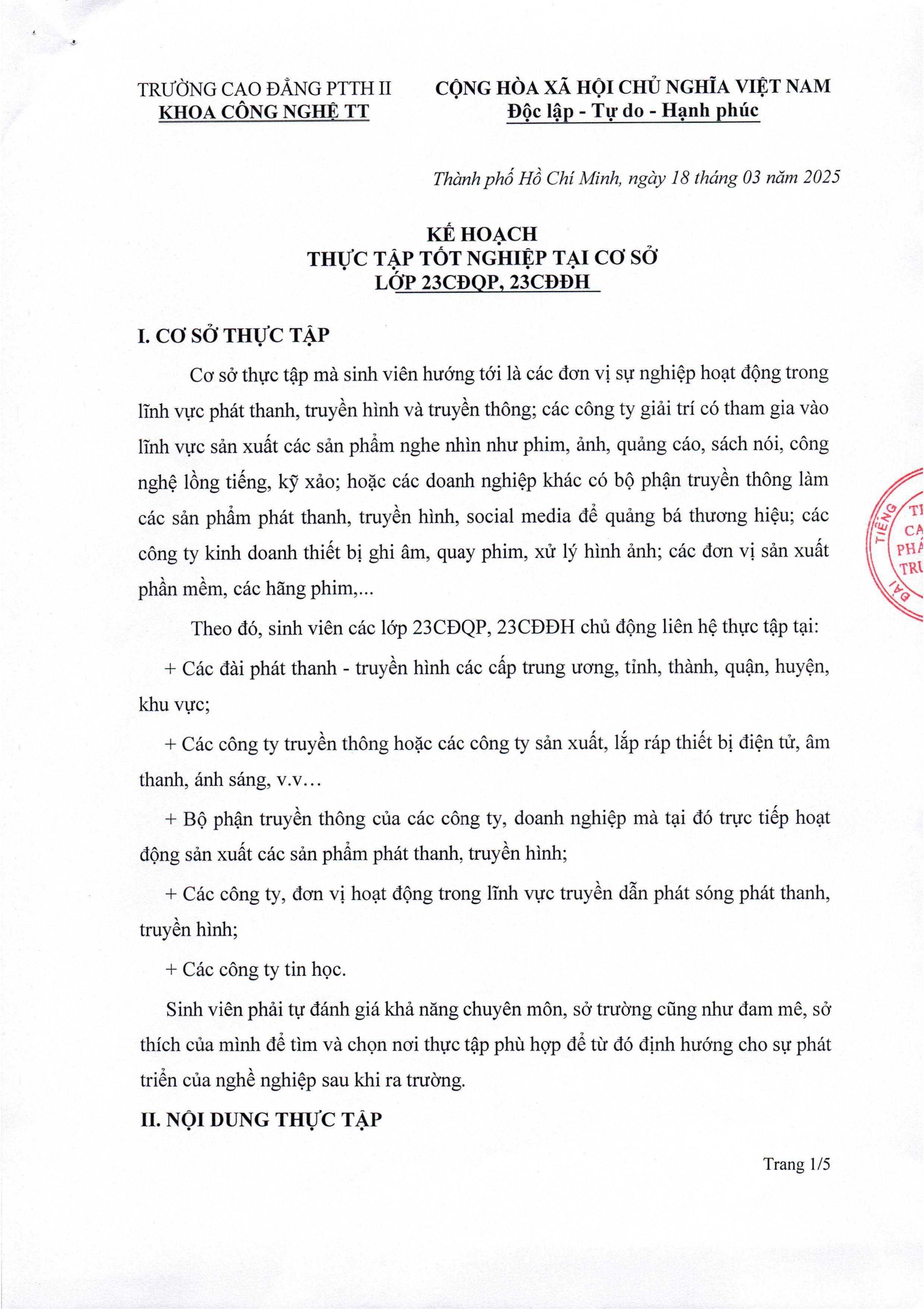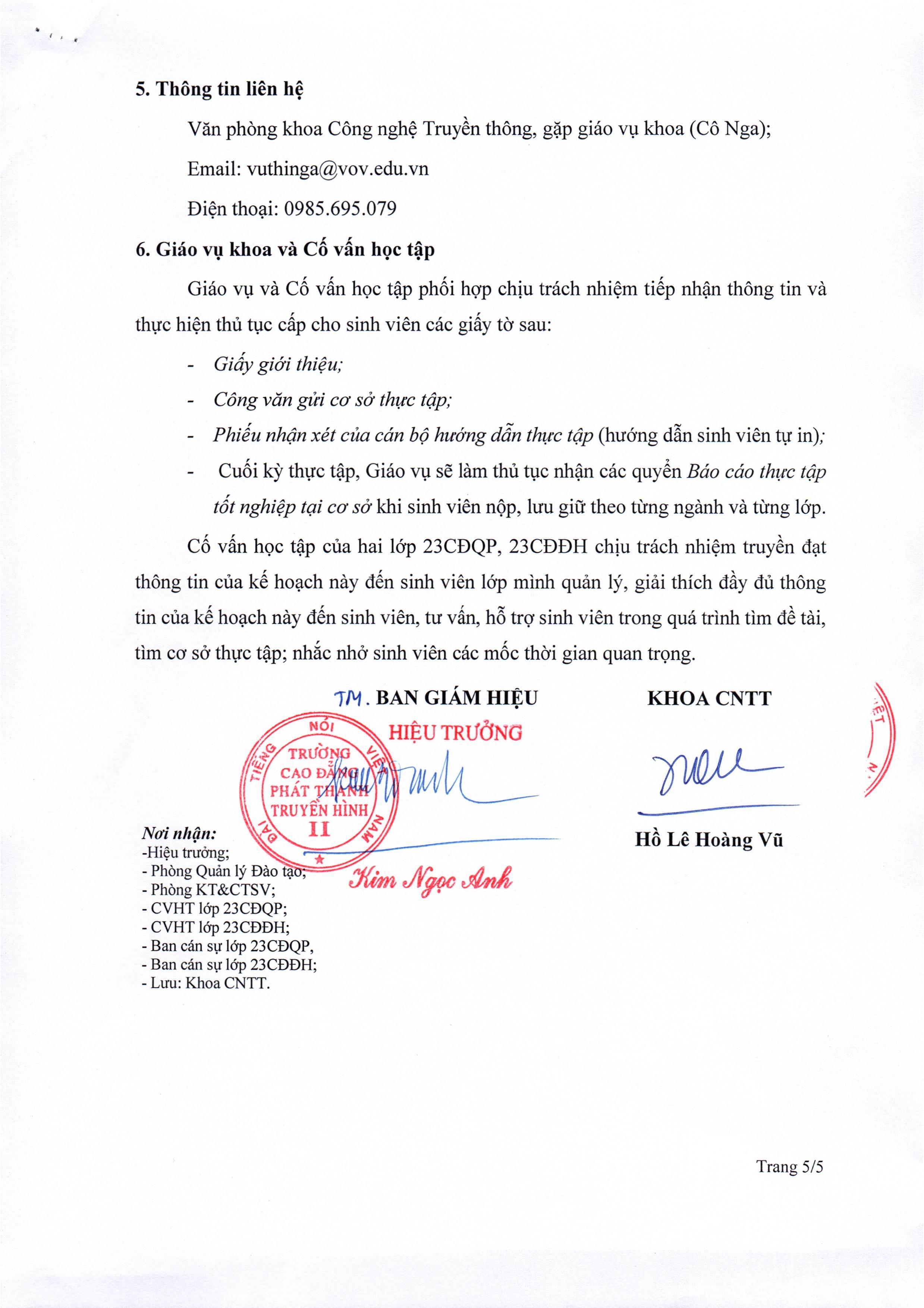 Kế hoạch thực tập tốt nghiệp tại cơ sở lớp 23CĐĐH, 23CĐQP (Tải về)