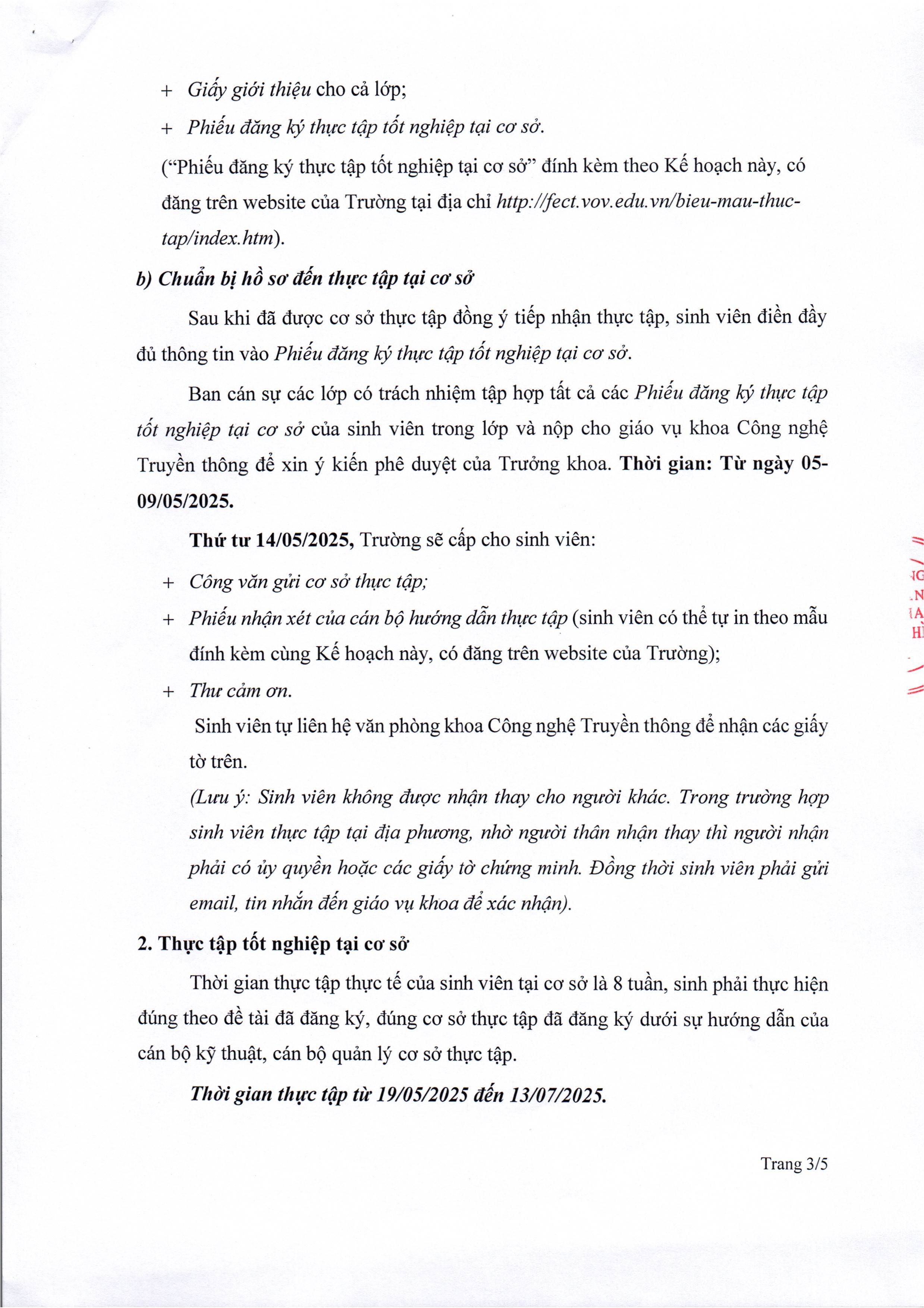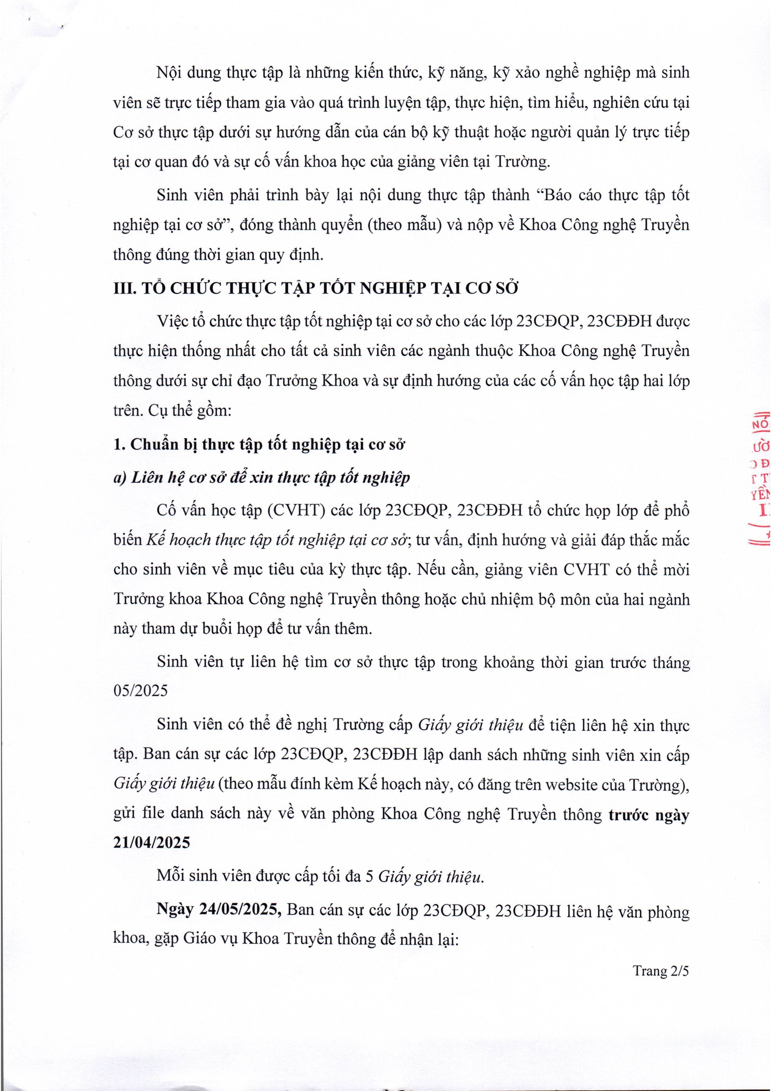 Kế hoạch thực tập tốt nghiệp tại cơ sở lớp 23CĐĐH, 23CĐQP
