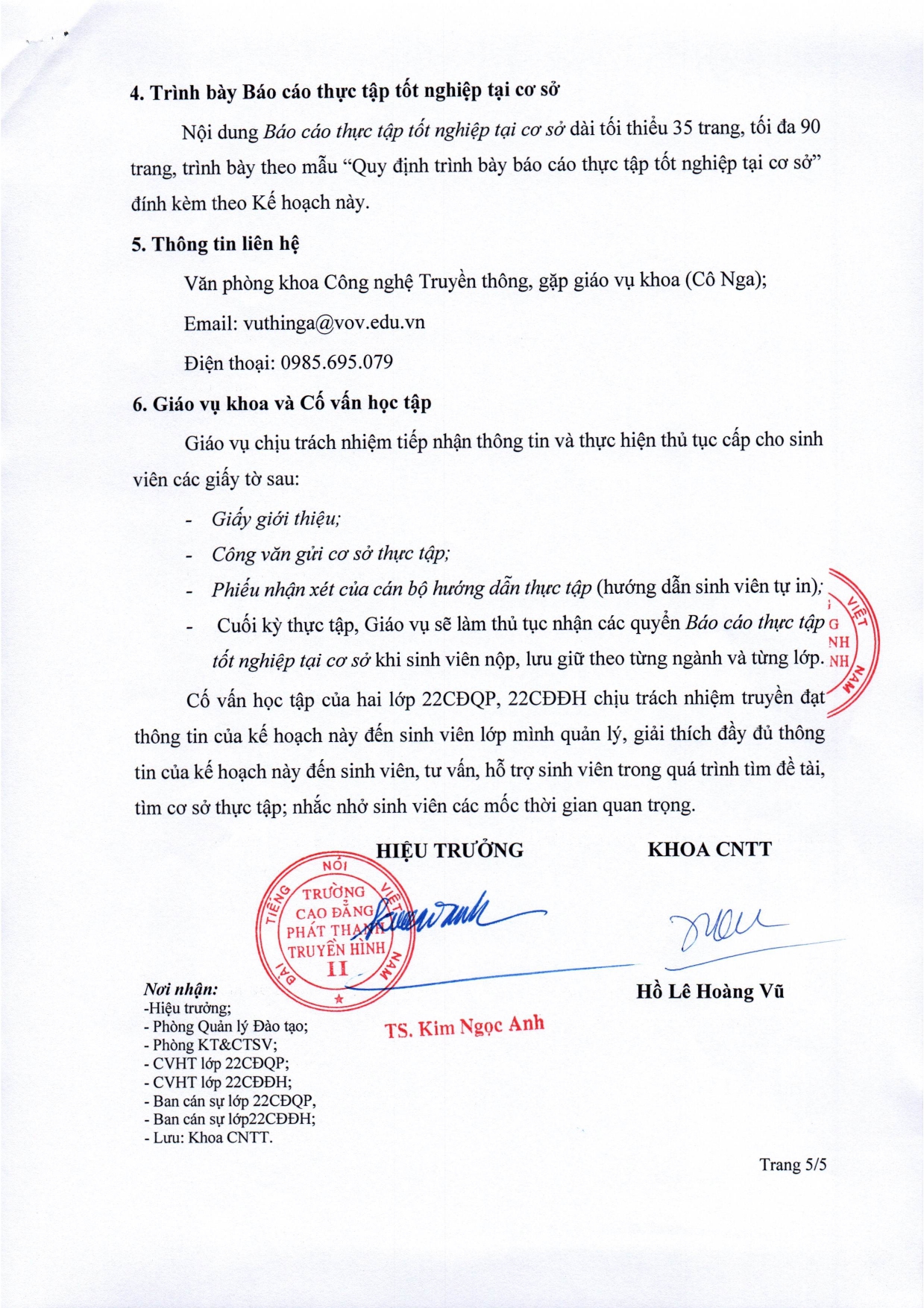 Kế hoạch thực tập tốt nghiệp tại trường lớp 23CĐQP, 23CĐĐH