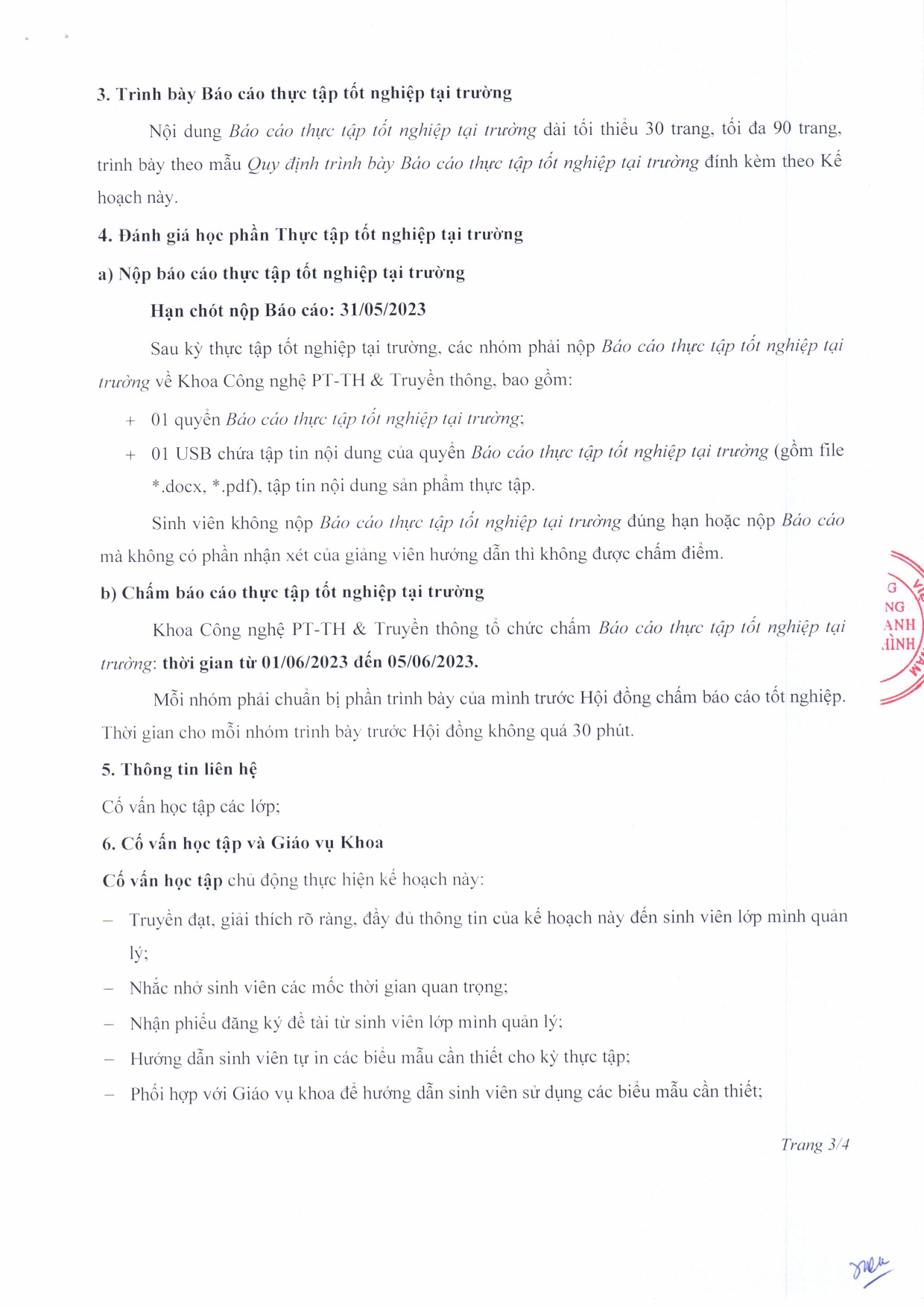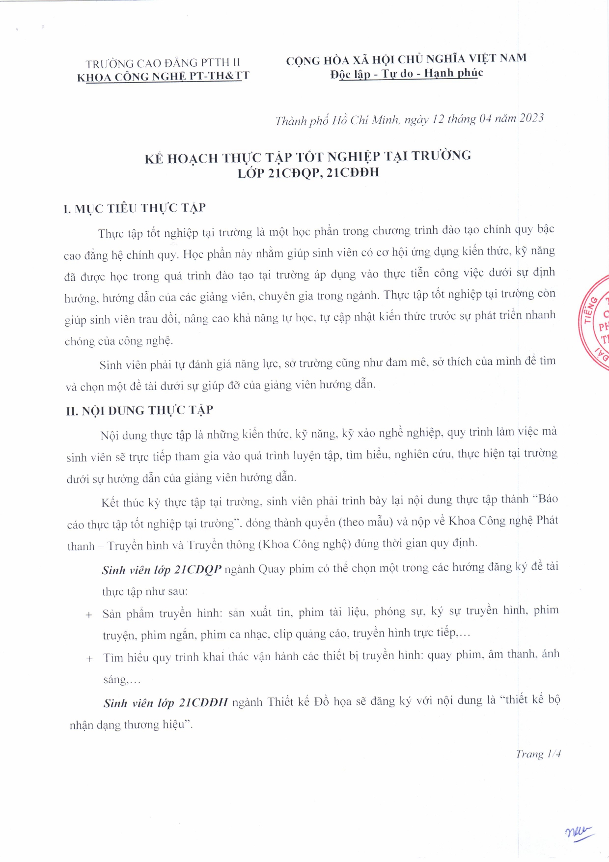 Kế hoạch thực tập tốt nghiệp tại trường lớp 23CĐQP, 23CĐĐH