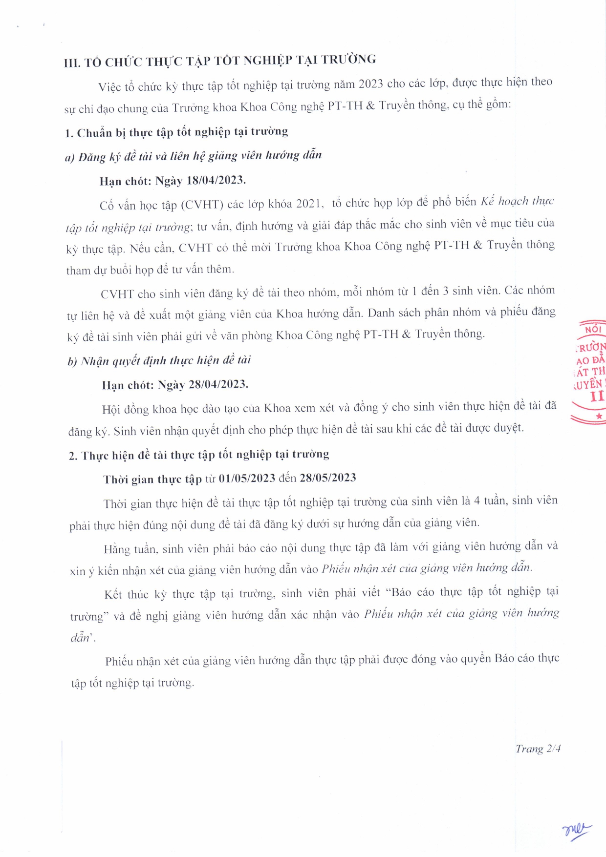 Kế hoạch thực tập tốt nghiệp tại cơ sở lớp 23CĐĐH, 23CĐQP