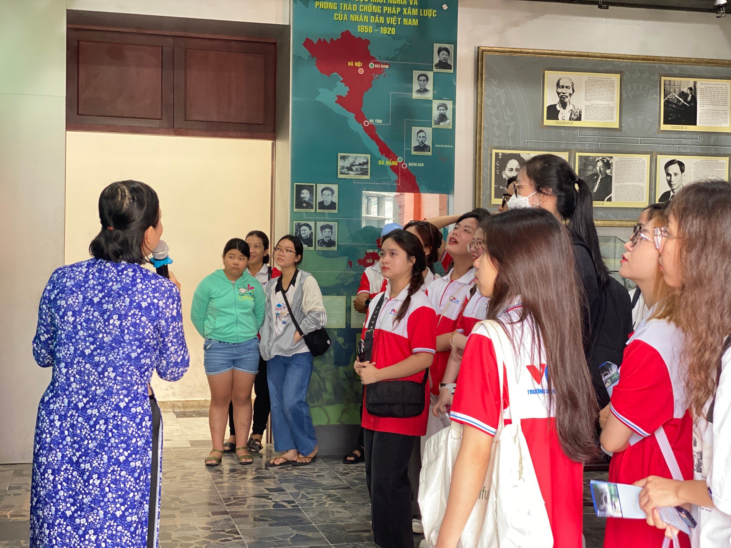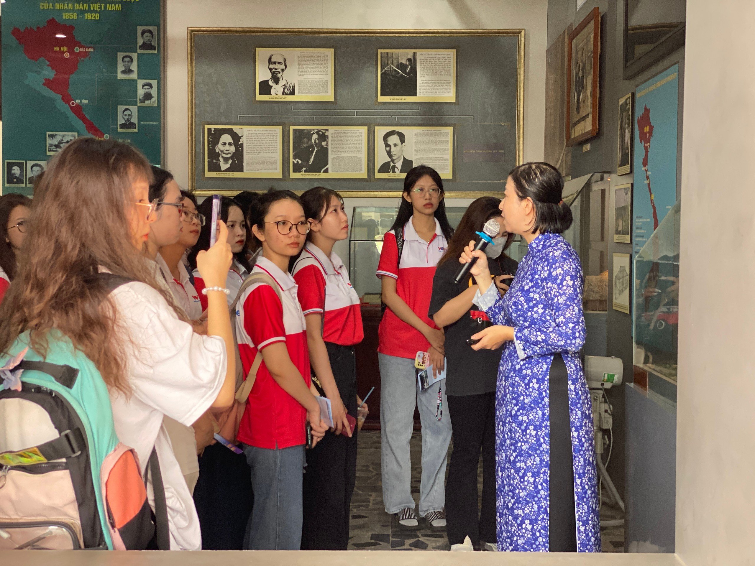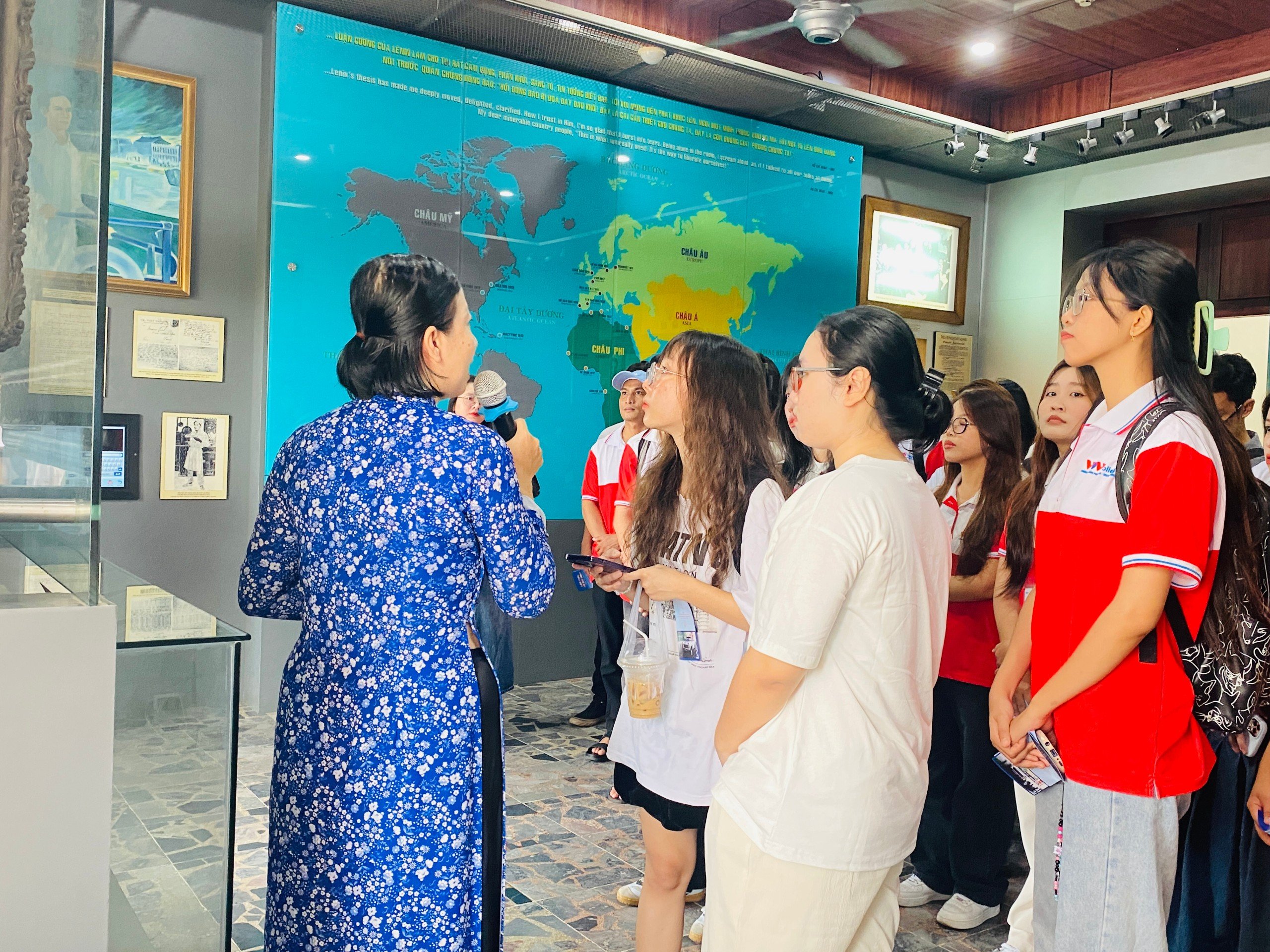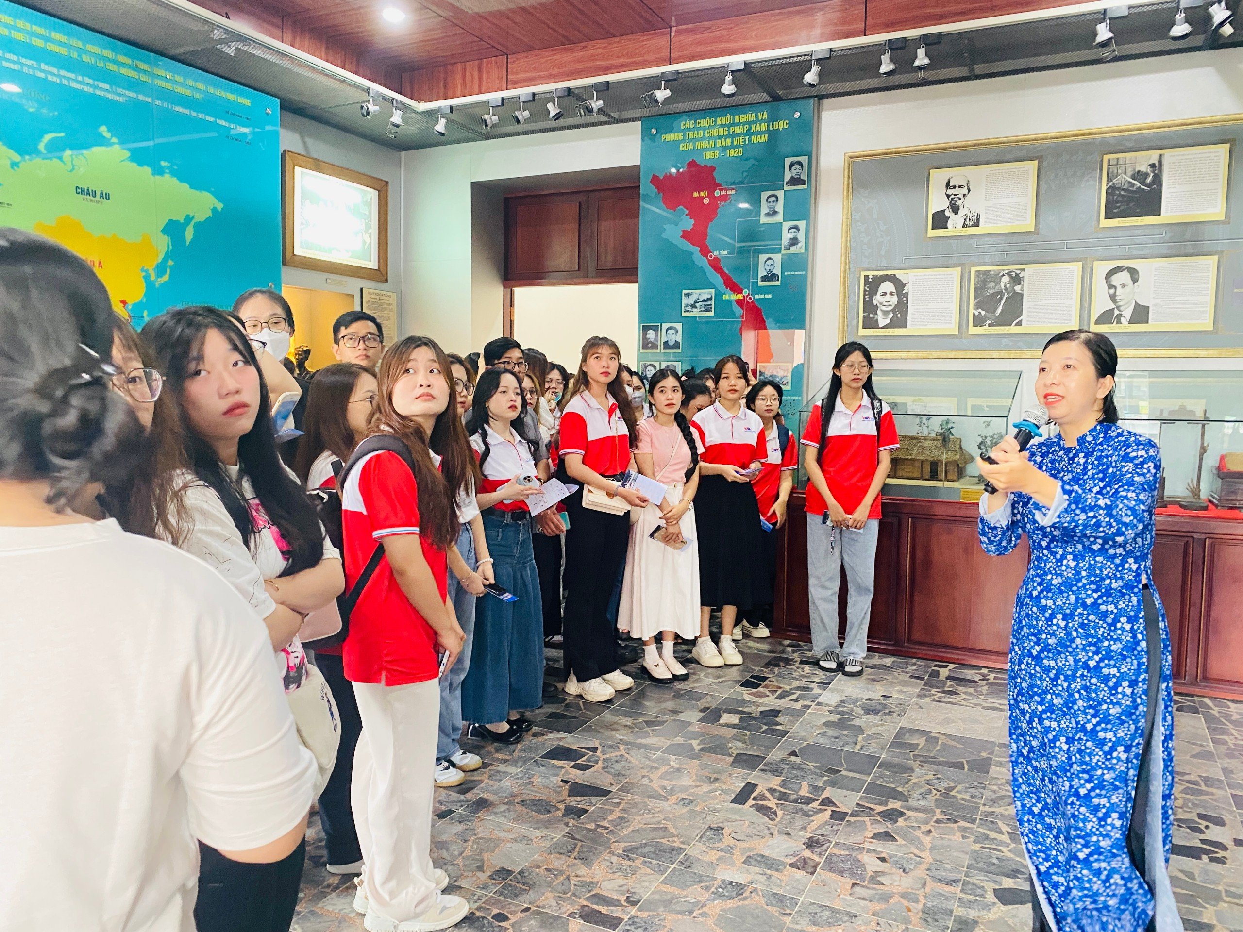 Các sinh viên chăm chú lắng nghe thuyết minh về quê hương, gia đình và thời niên thiếu của chủ tịch Hồ Chí Minh.