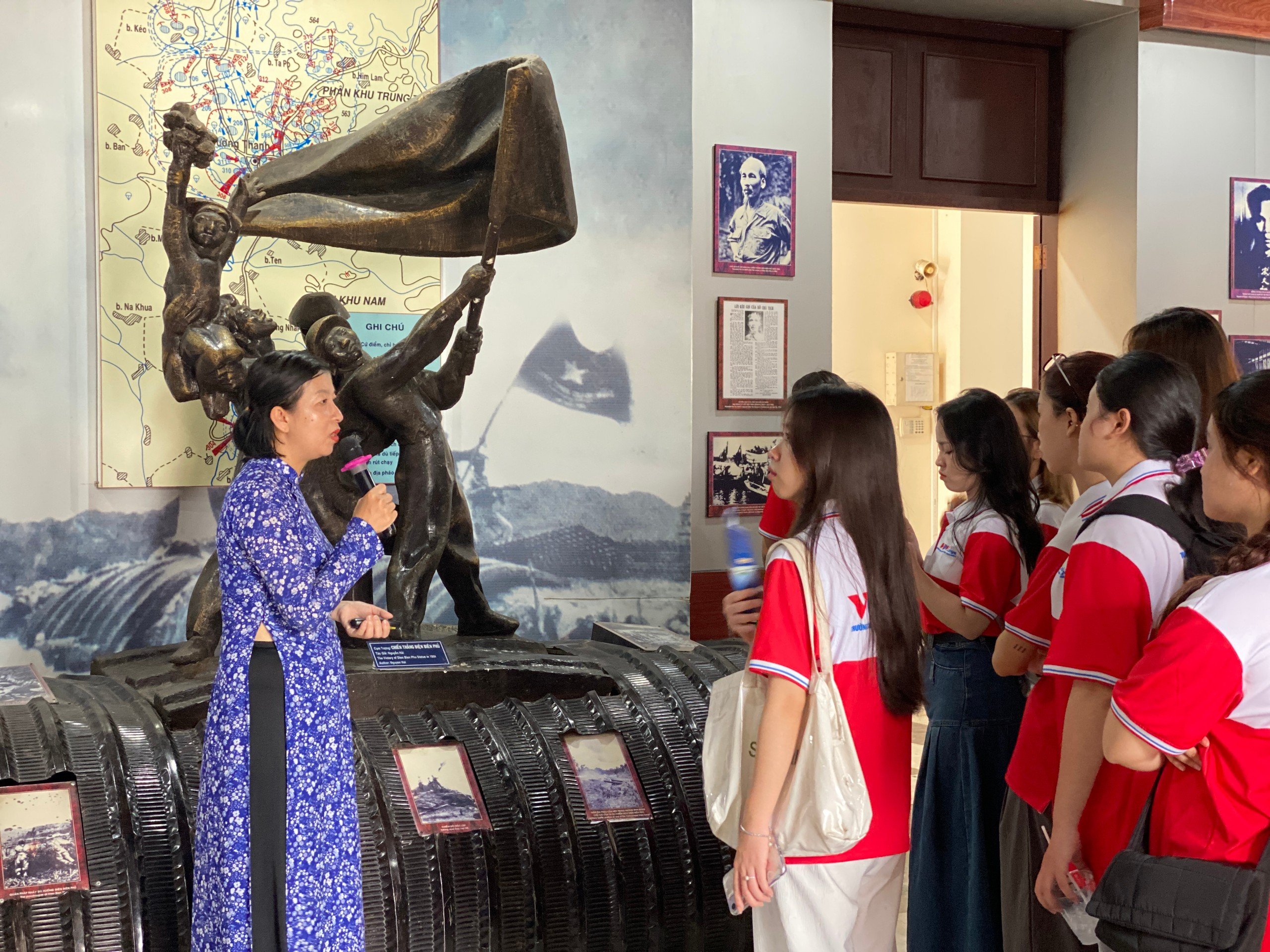 Sinh viên đang nghe thuyết minh về Tượng đài Chiến thắng Điện Biên Phủ.