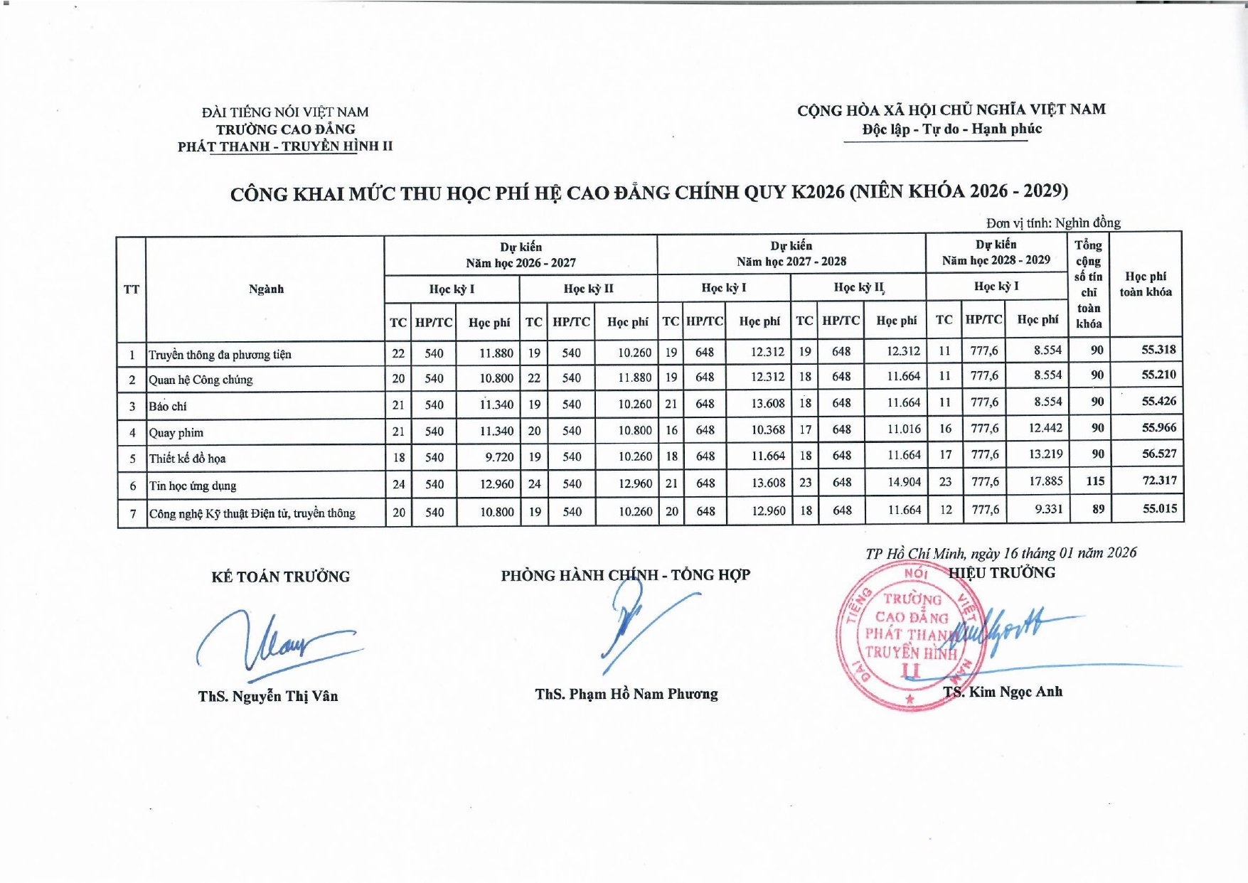 Công khai mức thu học phí hệ cao đẳng chính quy toàn khóa 2026-2029 (Tải về)
