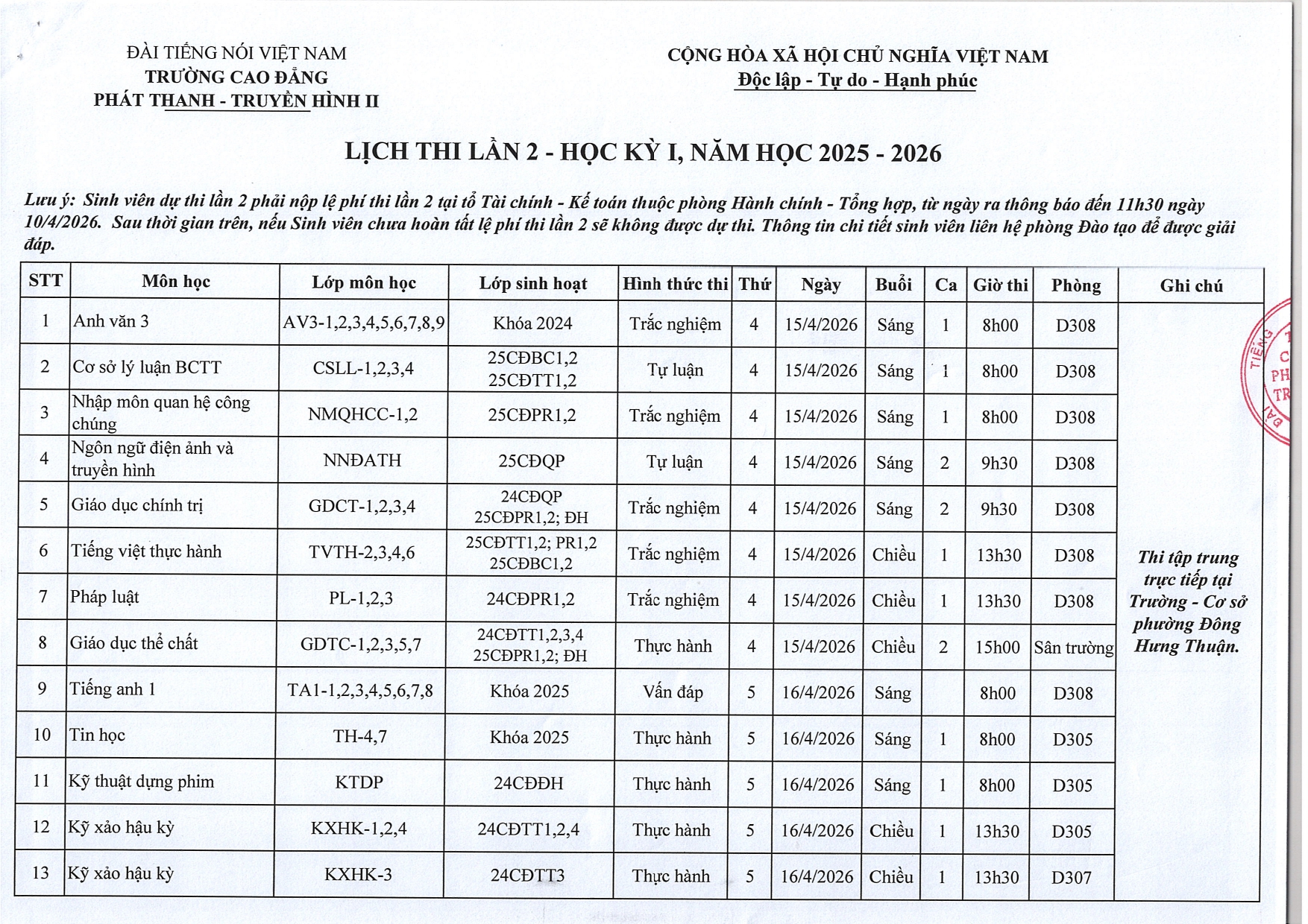 LỊCH THI VÀ DANH SÁCH LẦN 2, HỌC KỲ I, NĂM HỌC 2025 - 2026