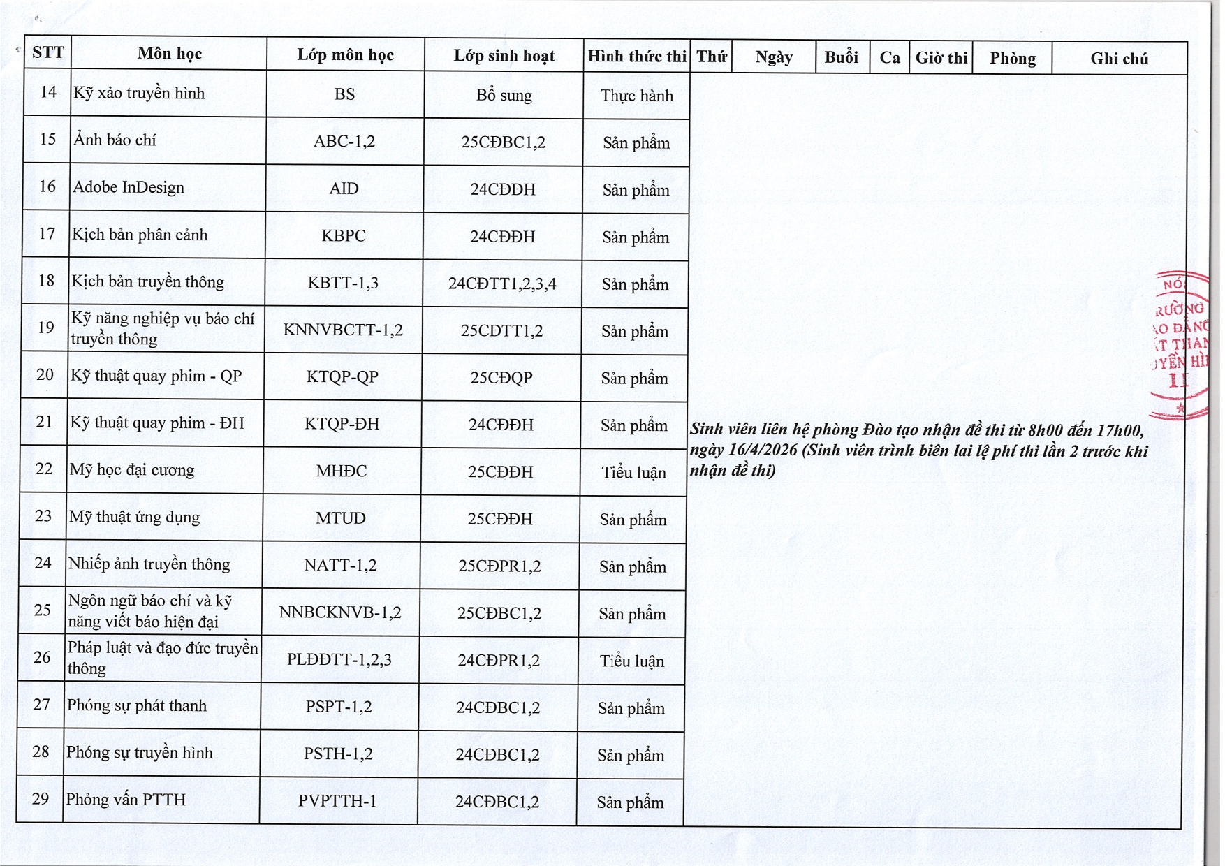 Danh sách dự thi kết thúc môn học kỳ II, năm học 2025 - 2026 (đợt 1)