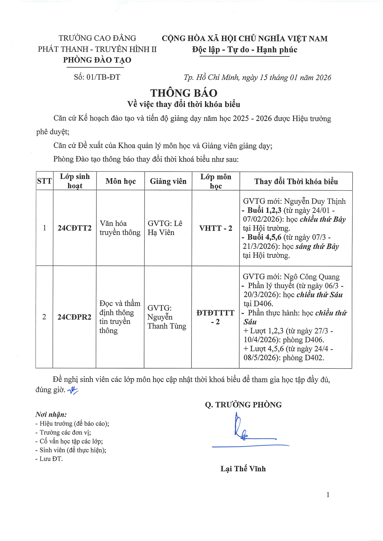 Thông báo về việc thay đổi thời khóa biểu