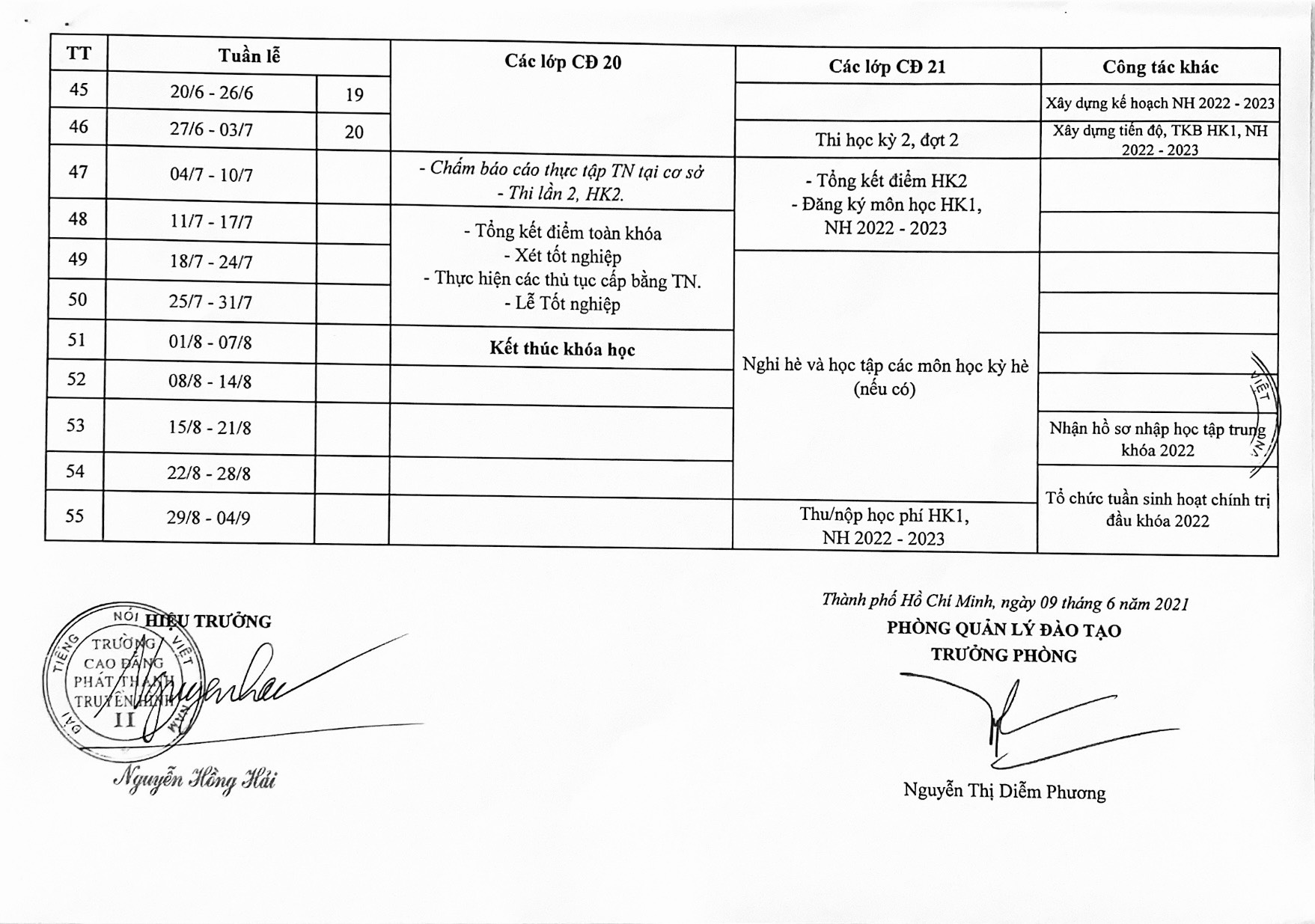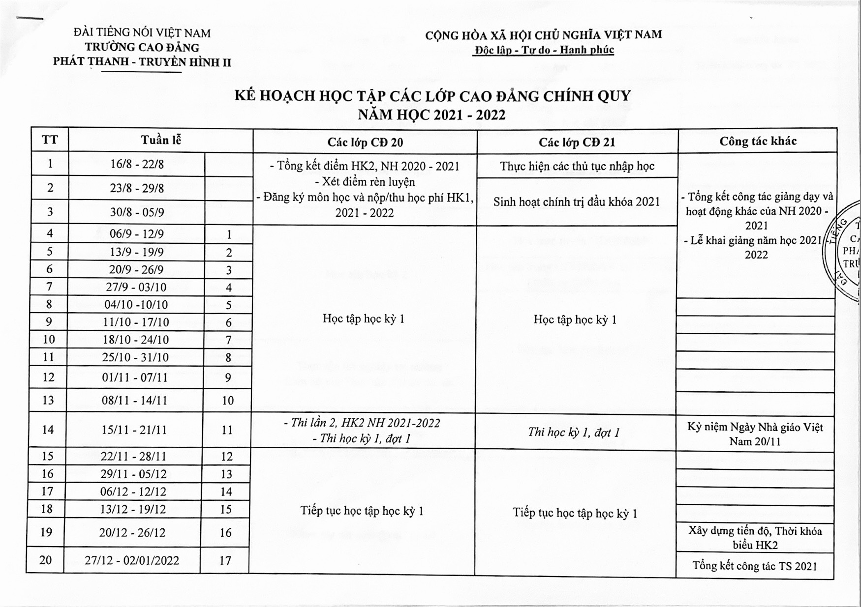 Kế hoạch học tập các lớp cao đẳng chính quy năm học 2021 - 2022