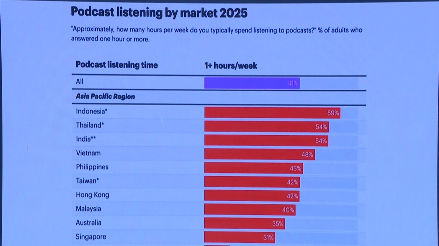 Nói về sự phát triển podcast trong thời gian qua tại Việt Nam, ông Andrew Davies cho rằng, Việt Nam đang có những bước phát triển rất mạnh tại khu vực Châu Á – Thái Bình Dương. Năm 2025, trong một nghiên cứu về thị hiếu toàn cầu cho thấy rằng, trong số 10 quốc gia khu vực Châu Á – Thái Bình Dương, Việt Nam xếp thứ 4 về số giờ xem mỗi tuần, chỉ sau Indonesia, Thái Lan và India.