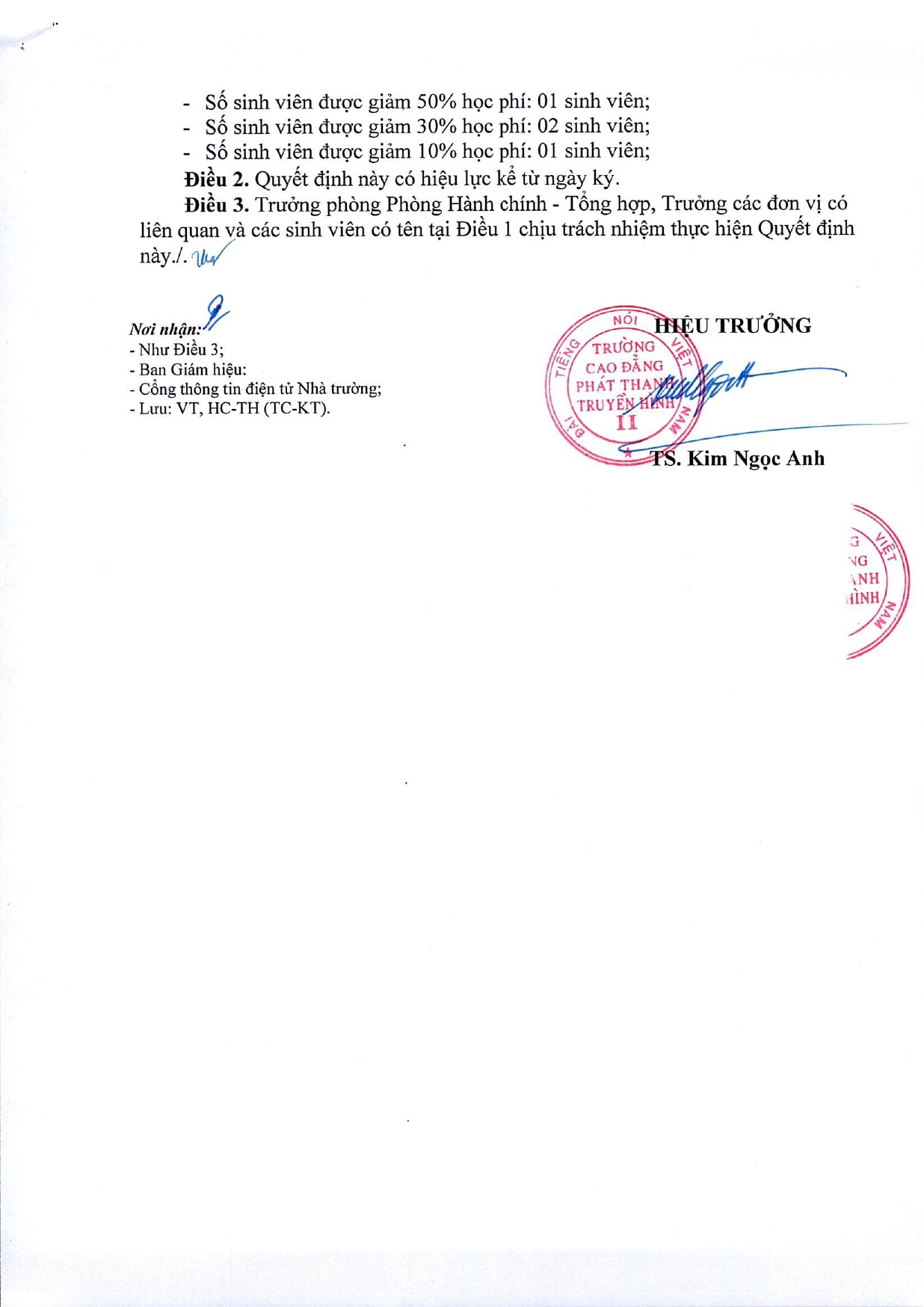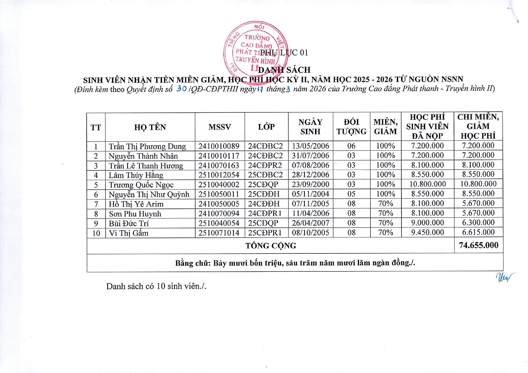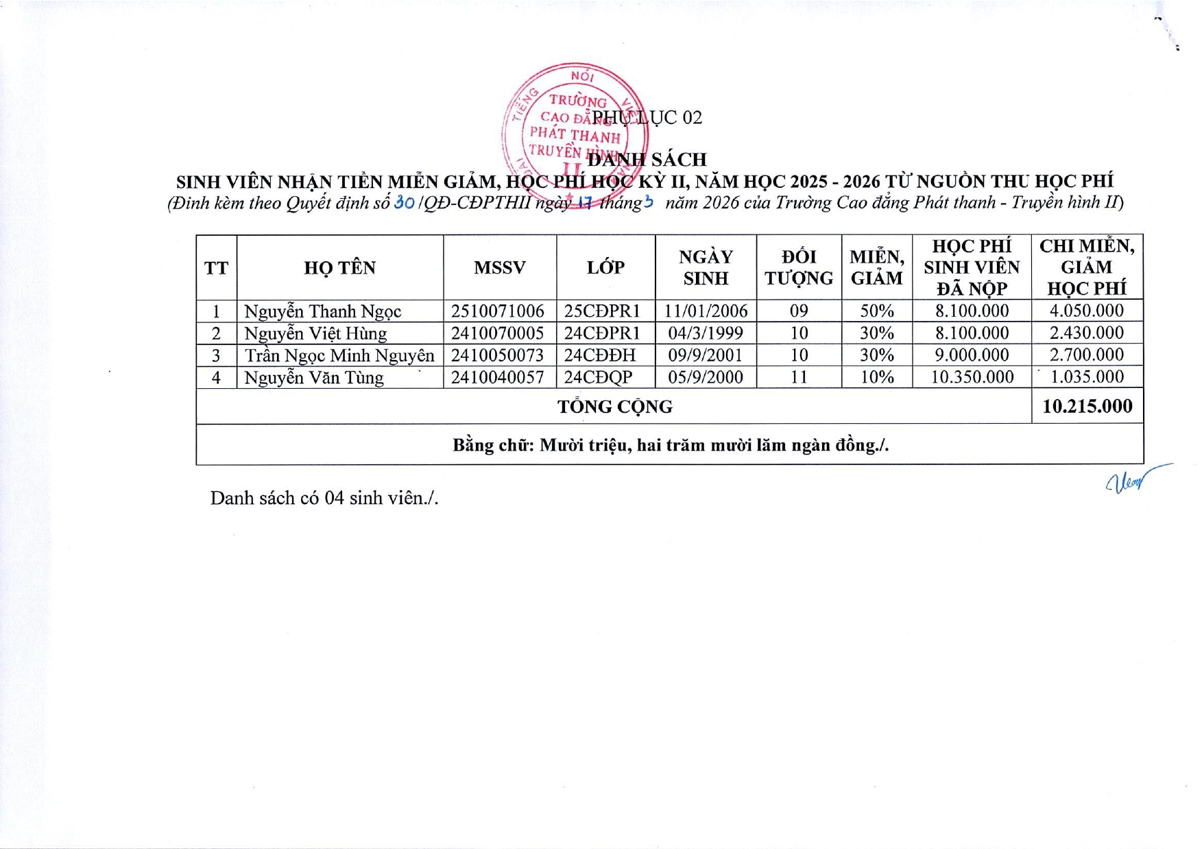 Quyết định về việc chi tiền miễn, giảm học phí Học kỳ II, Năm học 2025 - 2026 cho sinh viên Cao đăng hệ chính quy