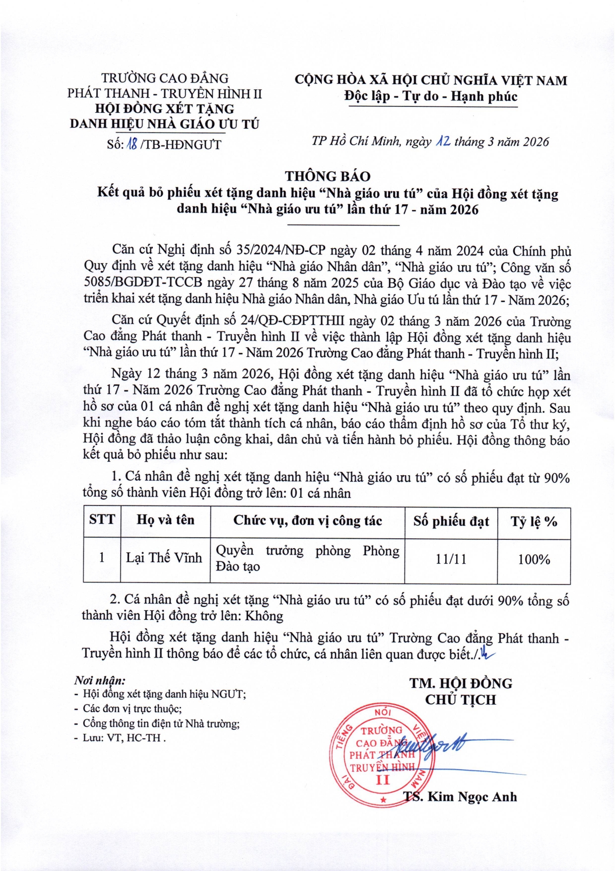 Thông báo kết quả bỏ phiếu xét tặng danh hiệu “Nhà giáo ưu tú” của Hội đồng xét tặng danh hiệu “Nhà giáo ưu tú” lần thứ 17 - năm 2026