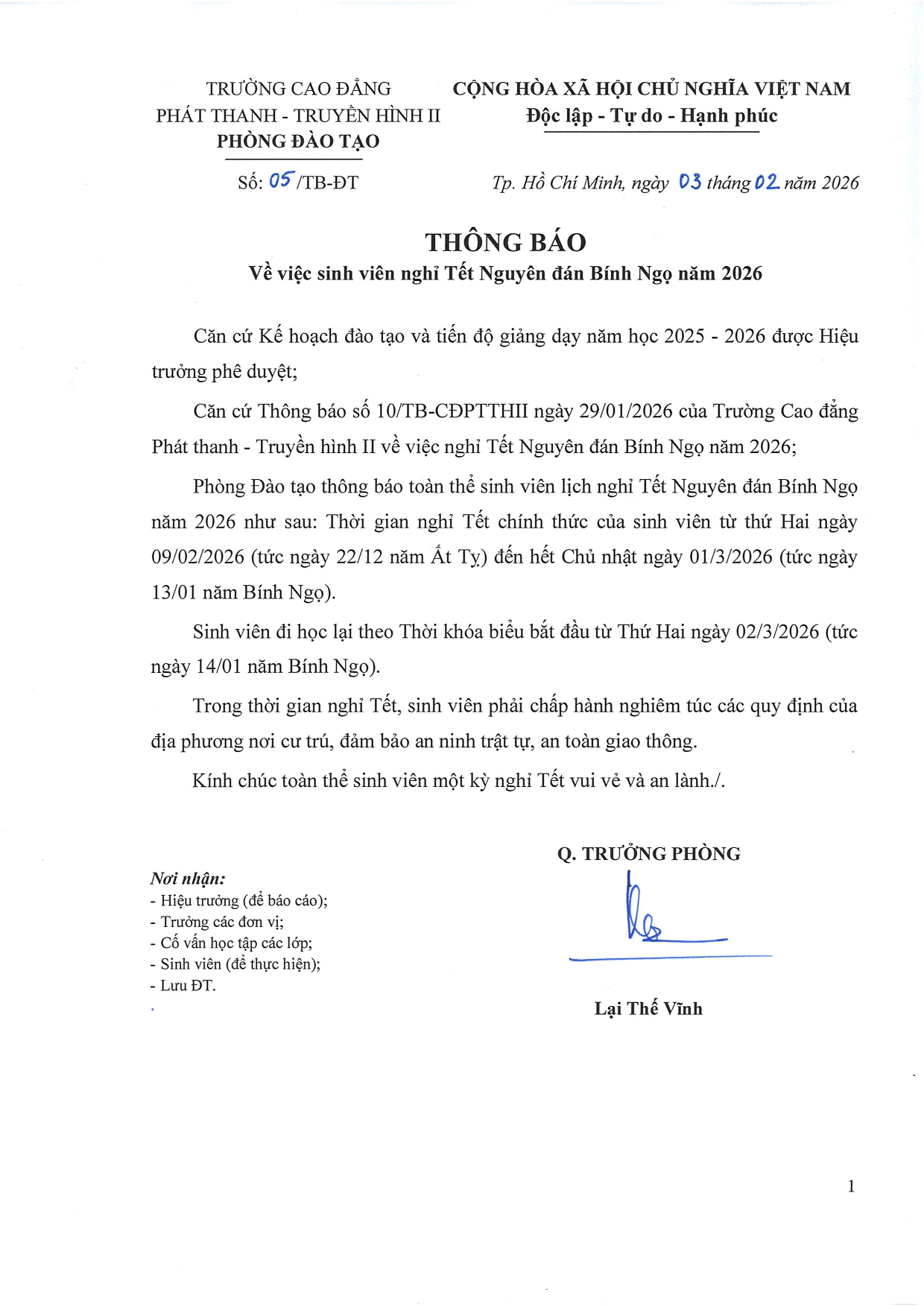 Thông báo về việc sinh viên nghỉ Tết Nguyên đán Bính Ngọ năm 2026