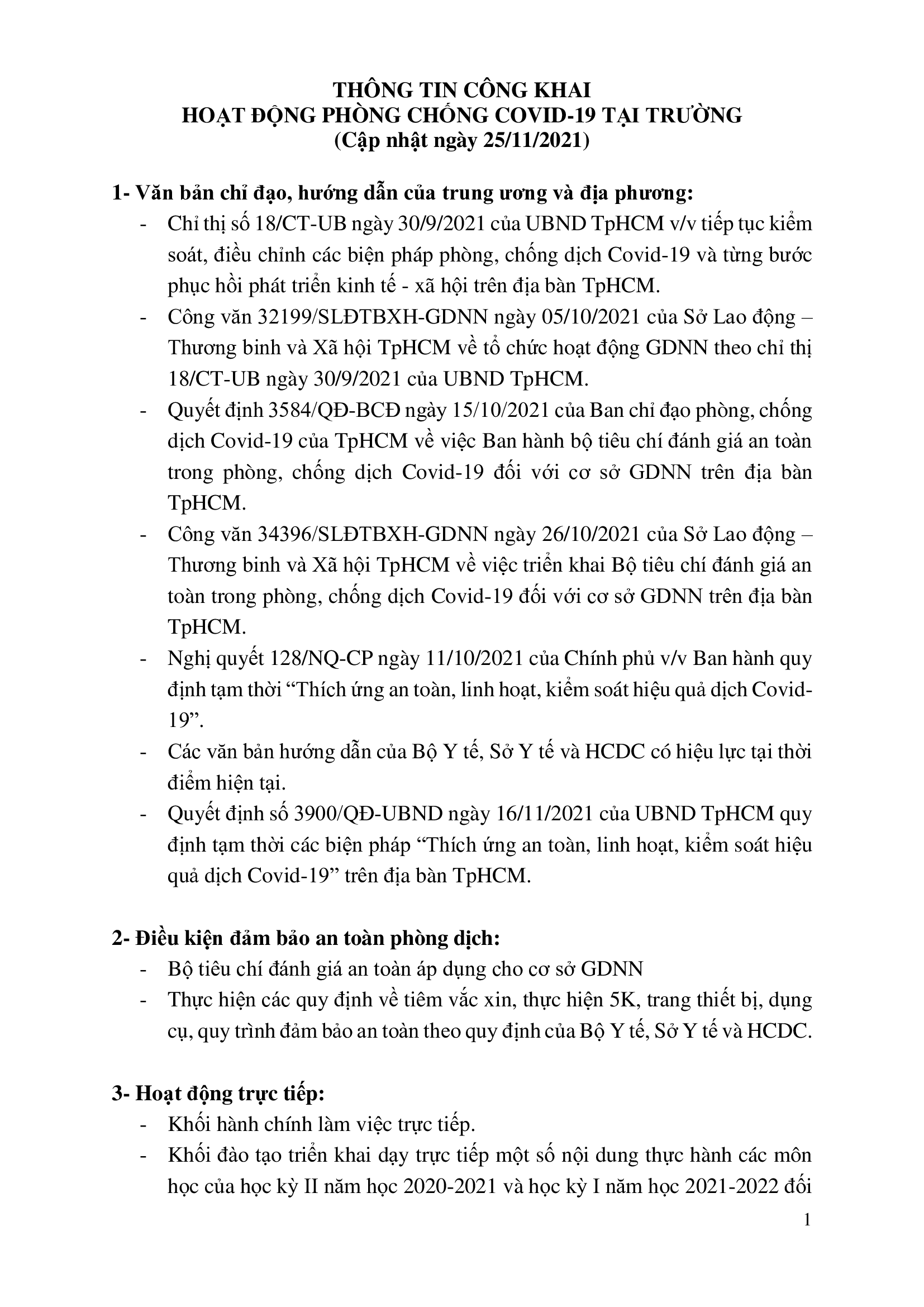 THÔNG TIN CÔNG KHAI HOẠT ĐỘNG PHÒNG CHỐNG COVID-19 TẠI TRƯỜNG