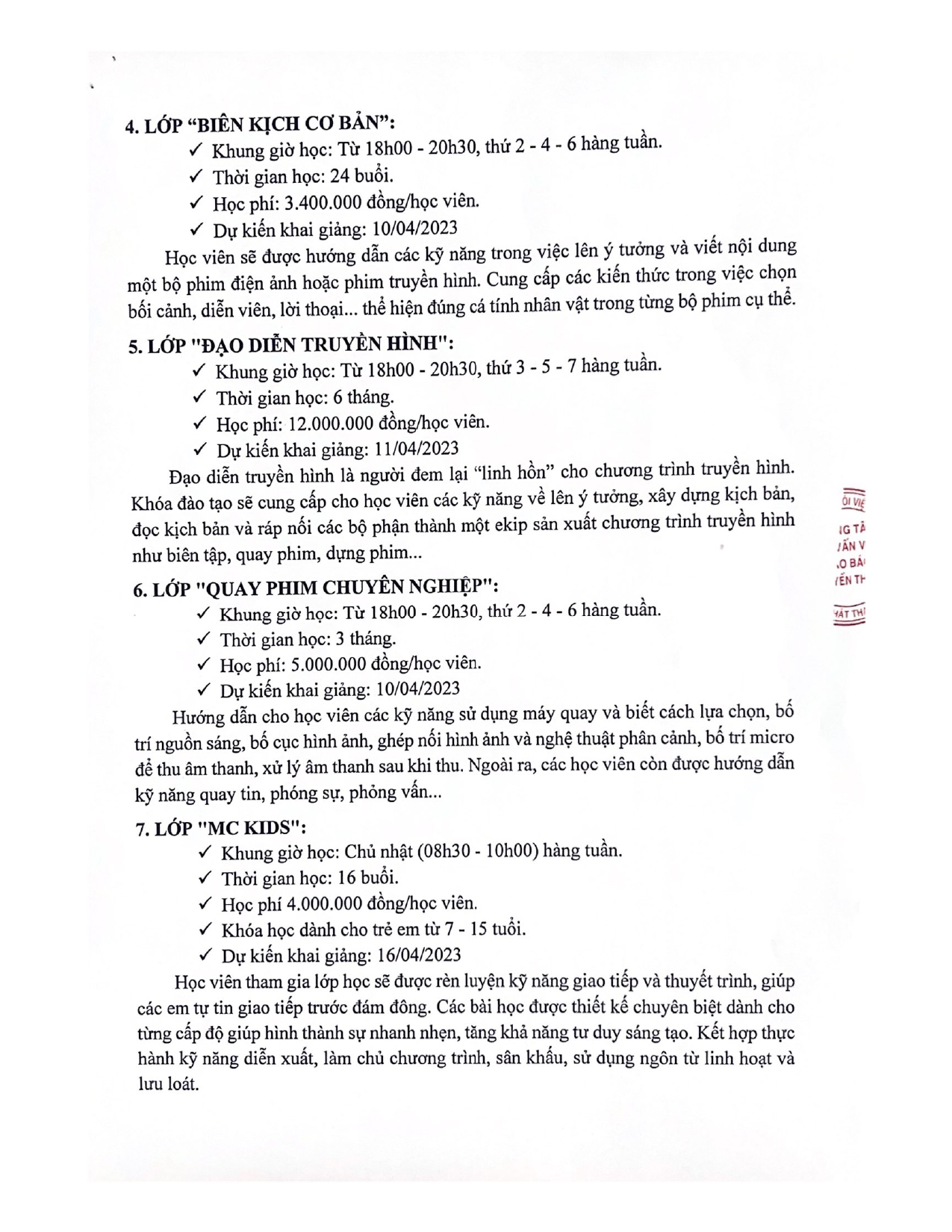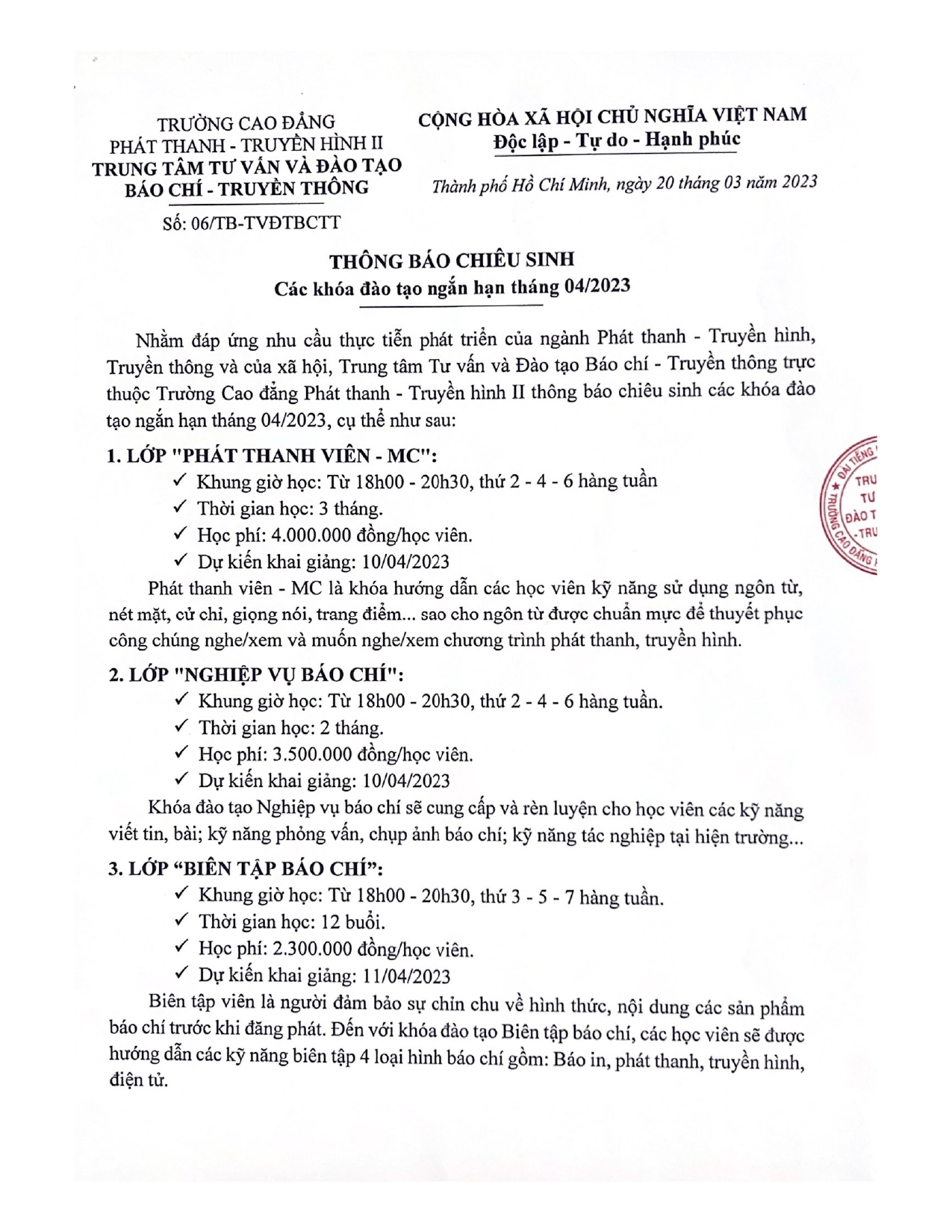 Thông báo chiêu sinh các khóa đào tạo ngắn hạn tháng 04/2023