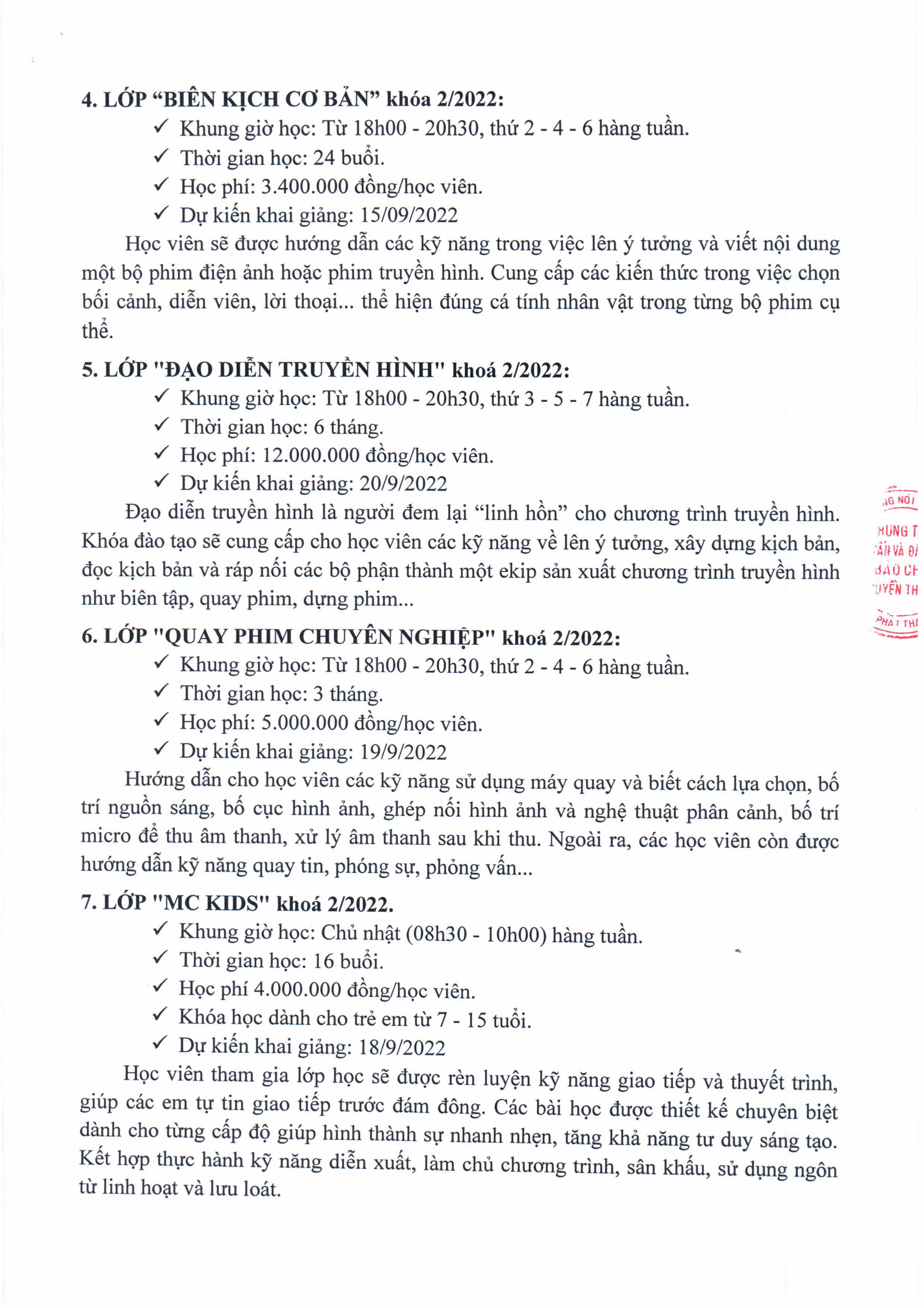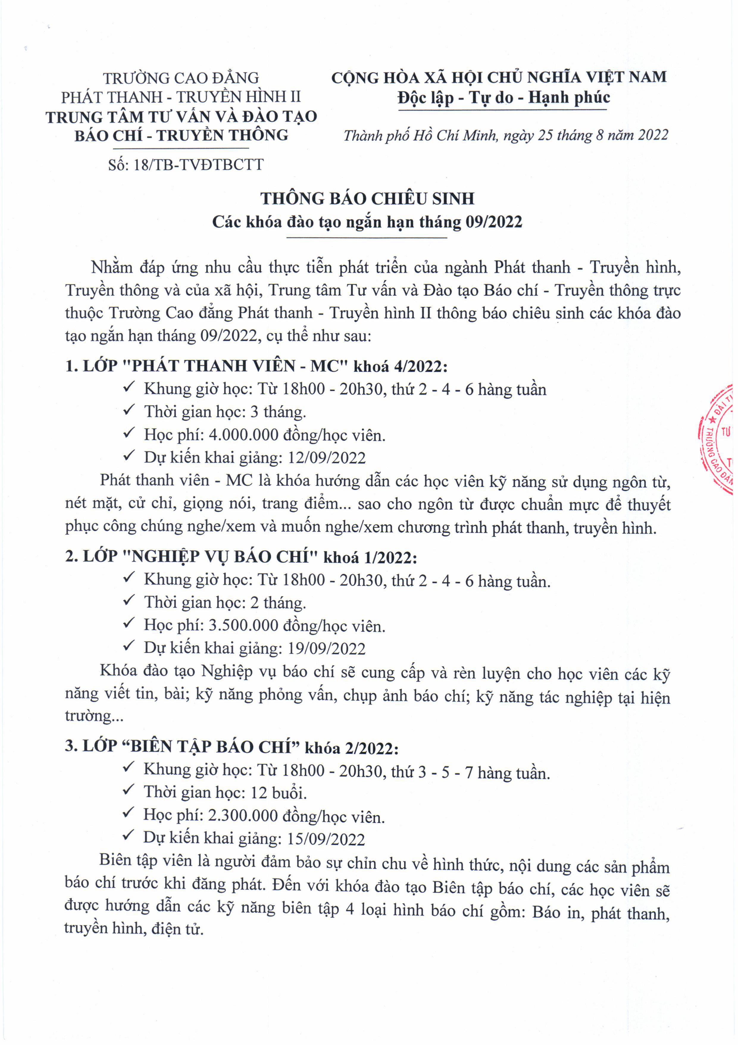 Thông báo chiêu sinh các khóa đào tạo ngắn hạn tháng 09/2022