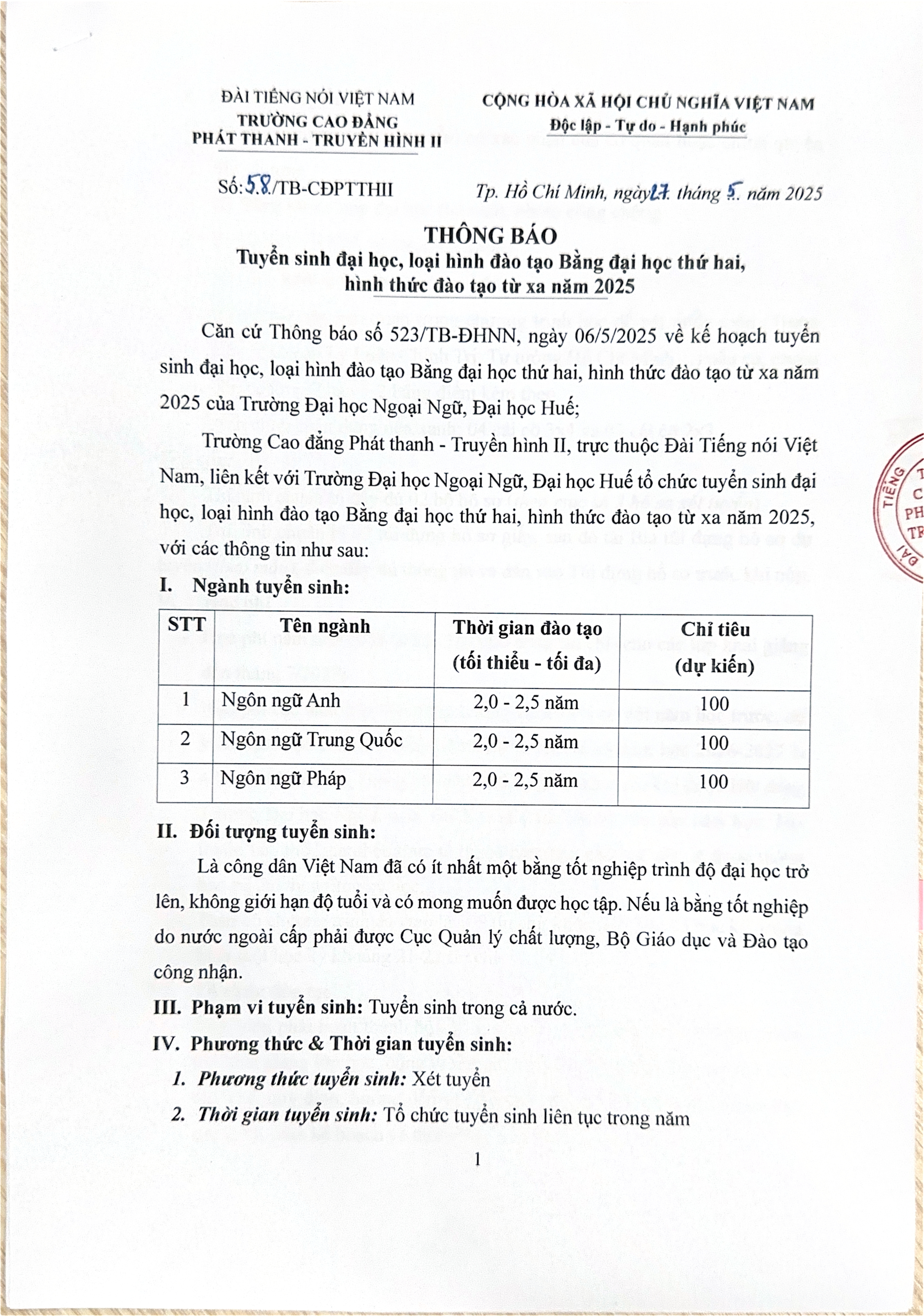 Thông báo tuyển sinh đại học, loại hình đào tạo Bằng đại học thứ 2, hình thức đào tạo từ xa năm 2025