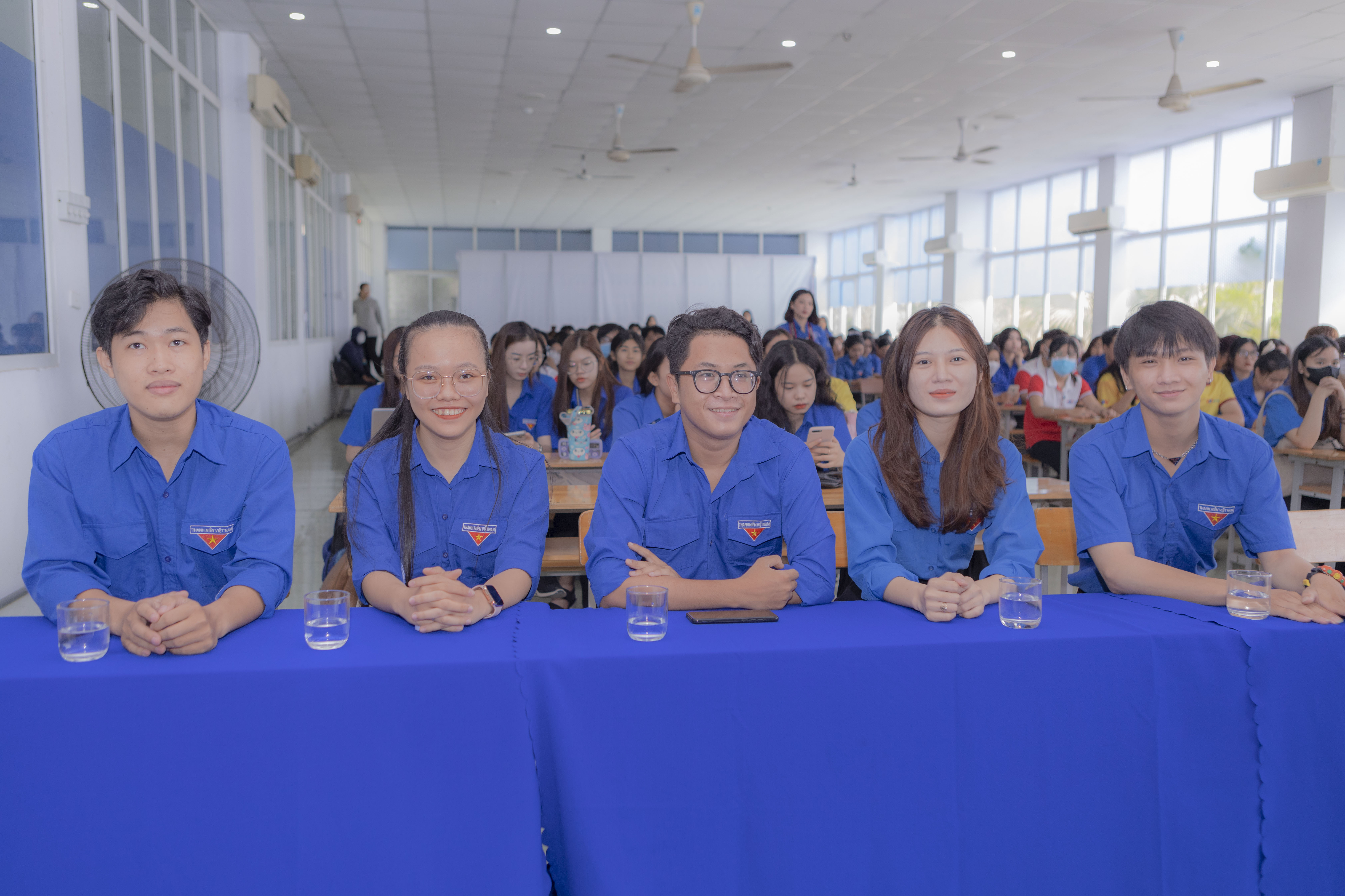 Các bạn tân Đoàn viên được Đồng Chí Đặng Thị Thùy Dung – Bí thư Đoàn trường trao thẻ và cài huy hiệu Đoàn.