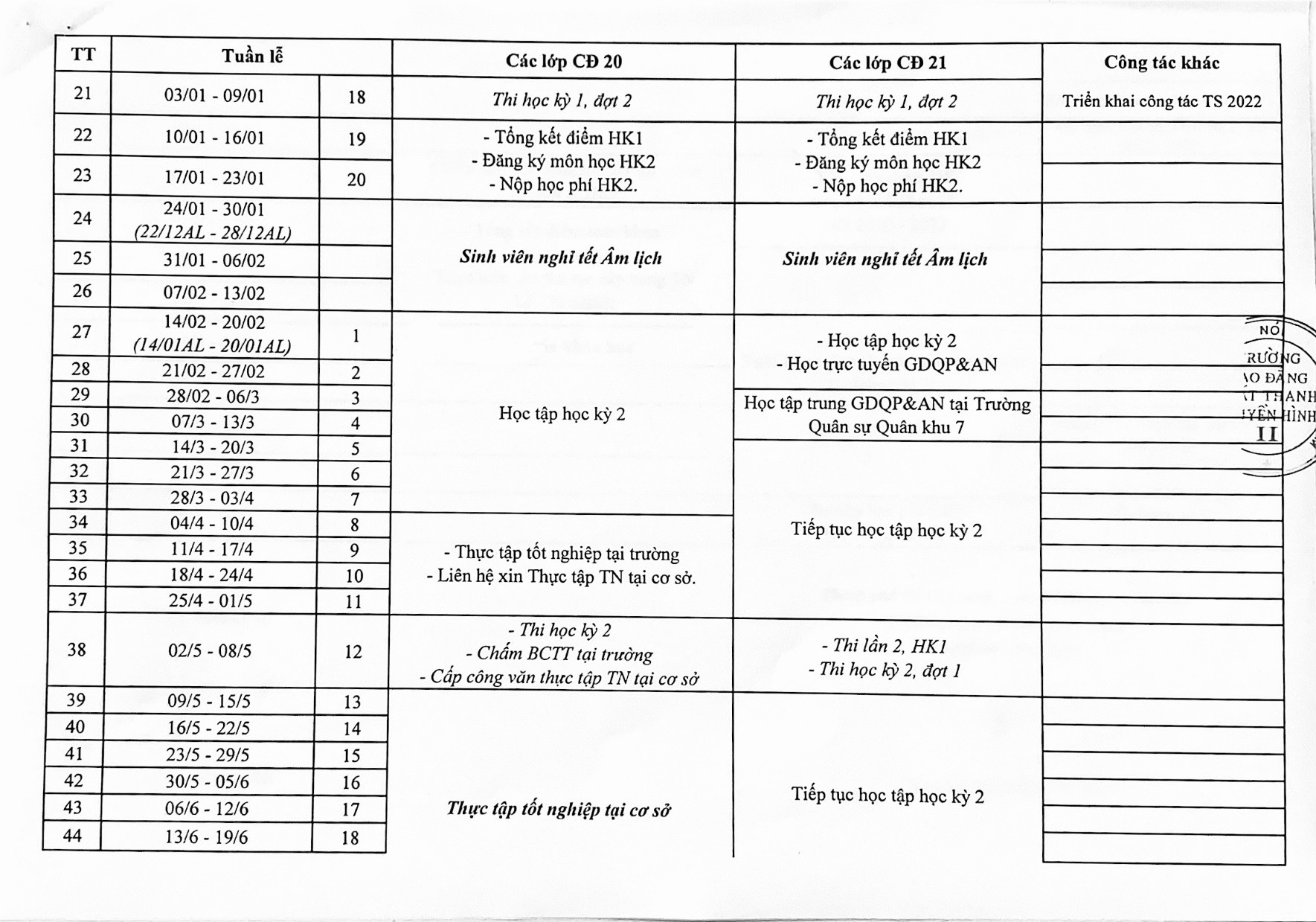 Kế hoạch học tập các lớp cao đẳng chính quy năm học 2021 - 2022