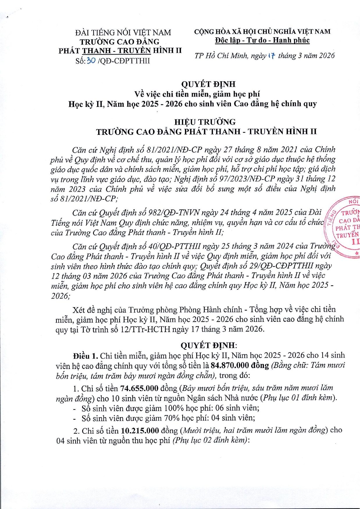 Quyết định về việc chi tiền miễn, giảm học phí Học kỳ II, Năm học 2025 - 2026 cho sinh viên Cao đăng hệ chính quy