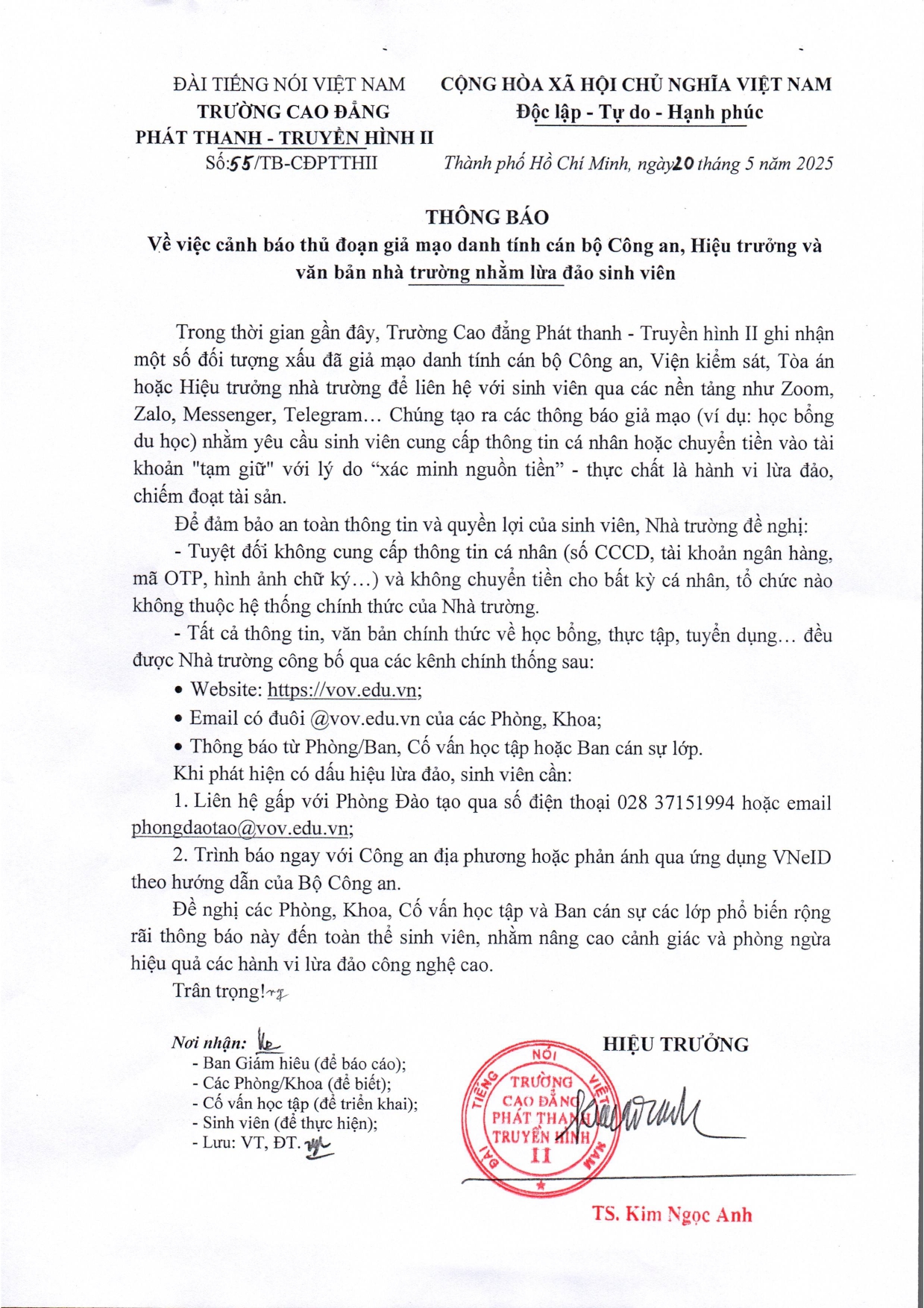 Thông báo về việc cảnh báo thủ đoạn giả mạo danh cán bộ Công an, Hiệu trưởng và van bản nhà trường nhằm lừa đảo sinh viên