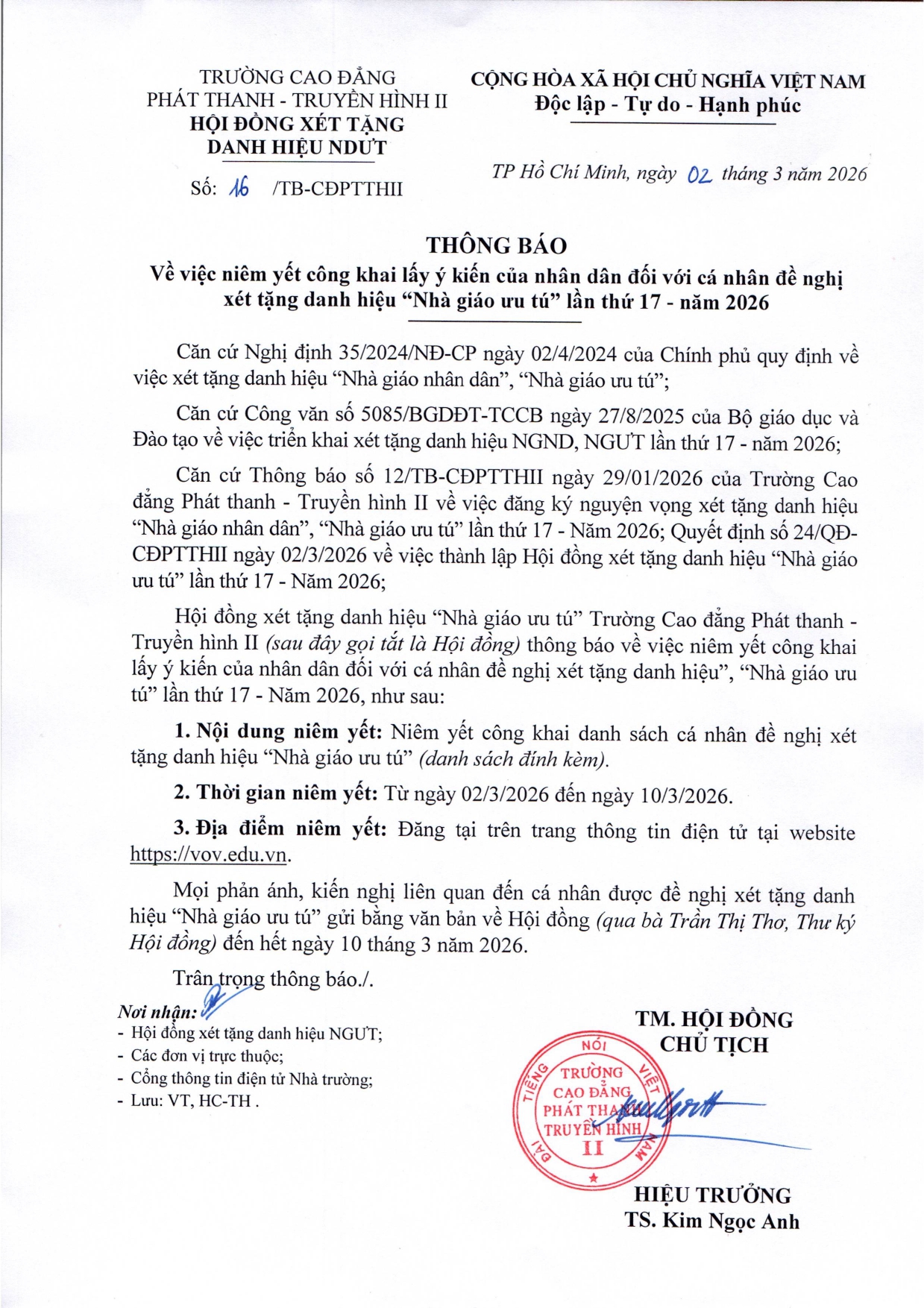 Thông báo về việc niêm yết công khai lấy ý kiến của nhân dân đối với cá nhân đề nghị xét tặng danh hiệu “Nhà giáo ưu tú” lần thứ 17 - năm 2026